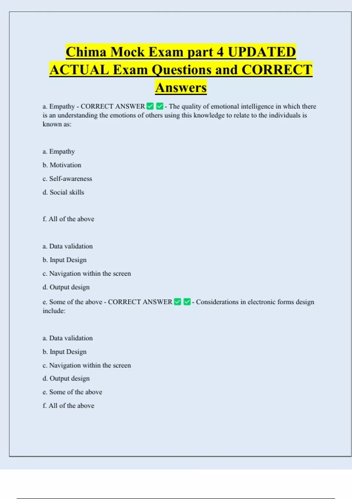 Chima Mock Exam part 4 UPDATED ACTUAL Exam Questions and CORRECT Answers a. Empathy - CORRECT ANSWER - The quality of emotional intelligence in which there is an understanding the emotions of others using this knowledge to relate to the individuals is known as: a. Empathy b. Motivation c. Self-awareness d. Social skills f. All of the above