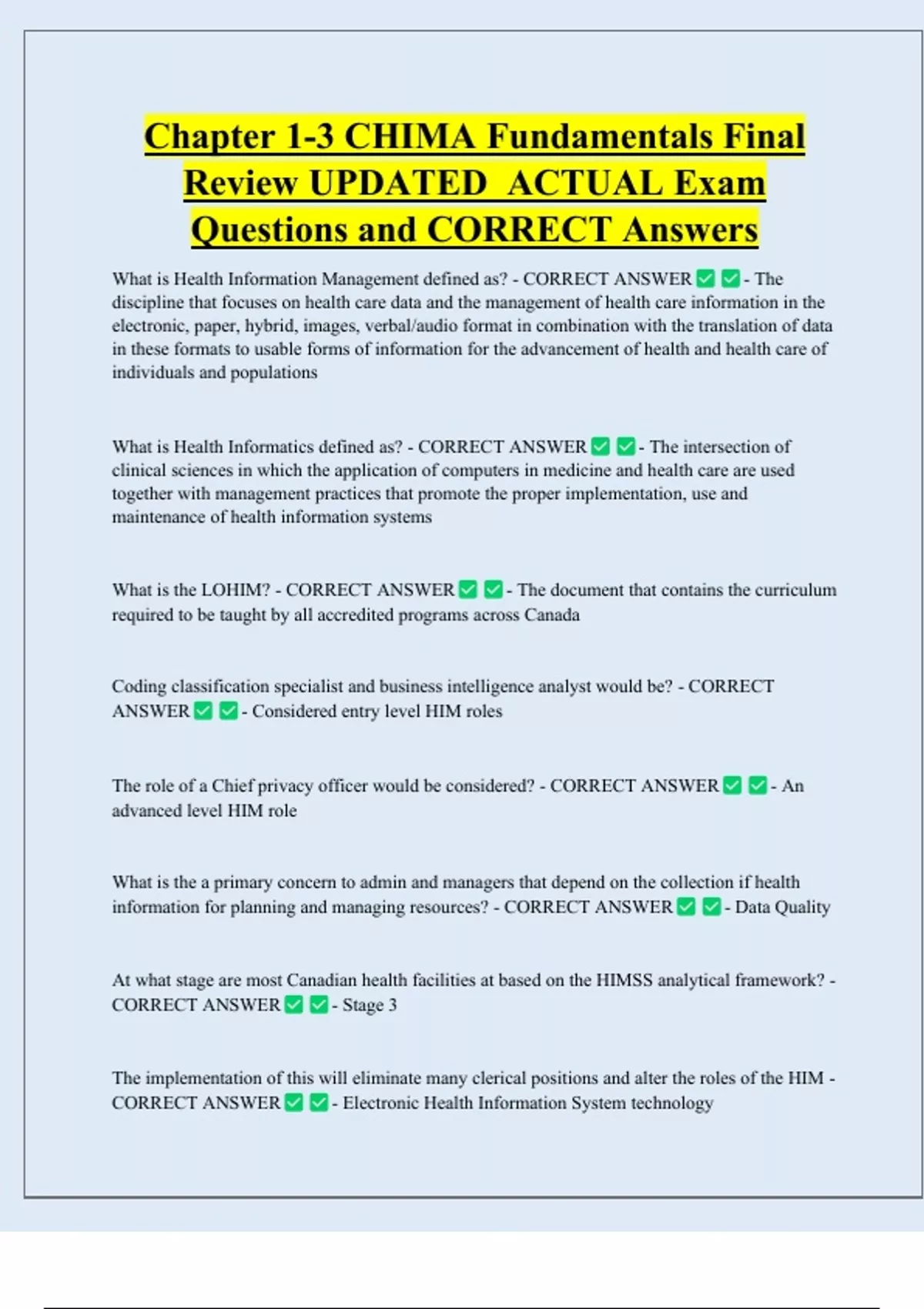 Chapter 1-3 CHIMA Fundamentals Final Review UPDATED ACTUAL Exam Questions and CORRECT Answers What is Health Information Management defined as? - CORRECT ANSWER - The discipline that focuses on health care data and the management of health care information in the electronic, paper, hybrid, images, verbal/audio format in combination with the translation of data in these formats to usable forms of information for the advancement of health and health care of individuals and populations What is Health Informatics defined as? - CORRECT ANSWER - The intersection of clinical sciences in which the application of computers in medicine and health care are used together with management practices that promote the proper implementation, use and maintenance of health information systems