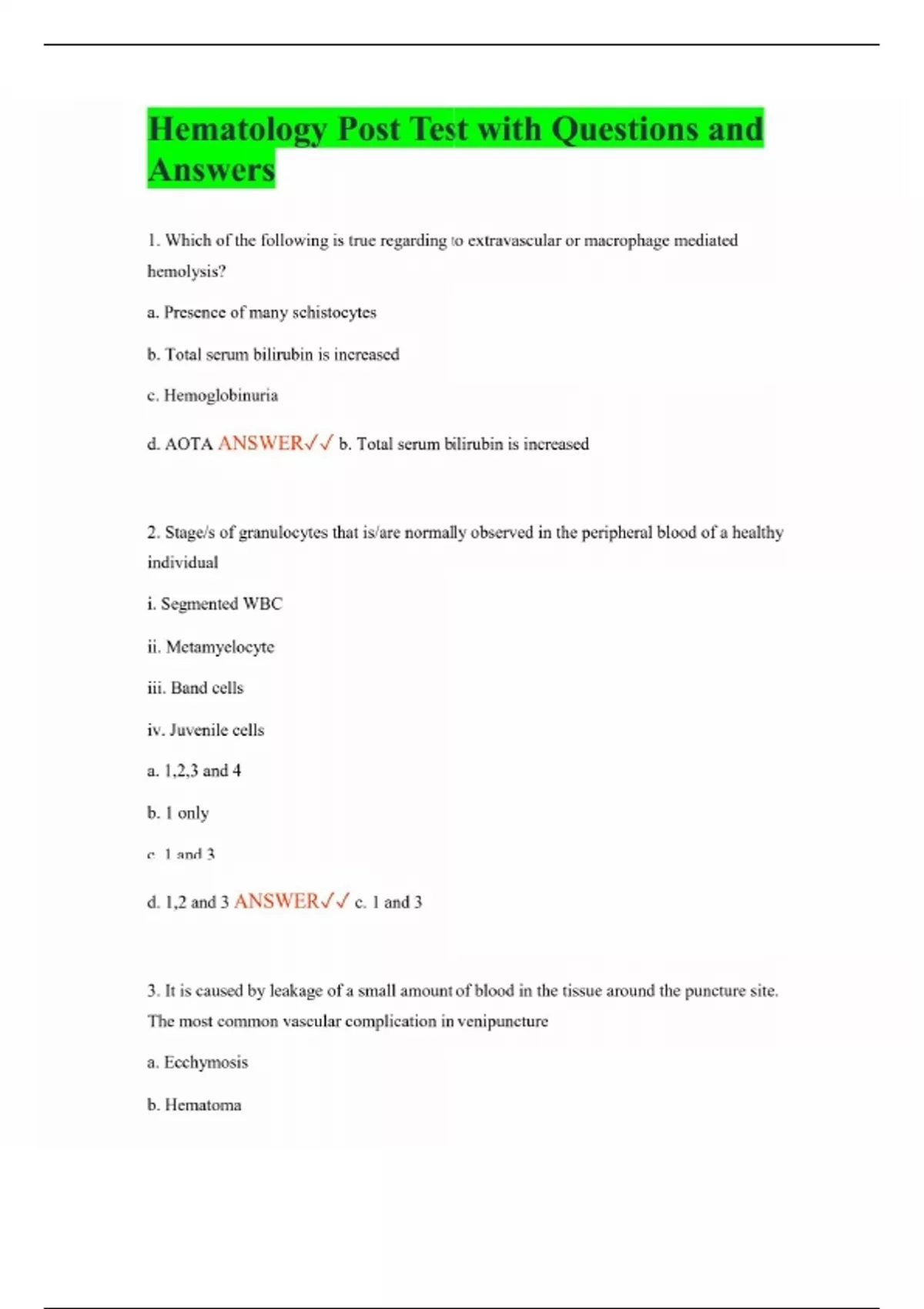 Hematology Post Test with Questions and Answers 1. Which of the following is true regarding to extravascular or macrophage mediated hemolysis? a. Presence of many schistocytes b. Total serum bilirubin is increased c. Hemoglobinuria d. AOTA ANSWER b. Total serum bilirubin is increased 2. Stage/s of granulocytes that is/are normally observed in the peripheral blood of a healthy individual i. Segmented WBC ii. Metamyelocyte iii. Band cells iv. Juvenile cells a. 1,2,3 and 4 b. 1 only c. 1 and 3 d. 1,2 and 3 ANSWER c. 1 and 3 3. It is caused by leakage of a small amount of blood in the tissue around the puncture site. The most common vascular complication in venipuncture a. Ecchymosis b. Hematoma