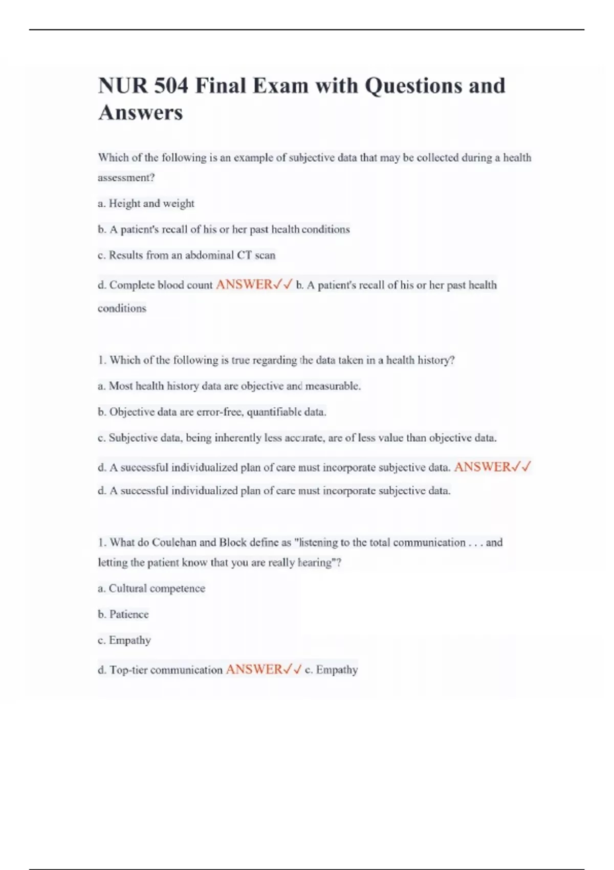 NUR 504 Final Exam with Questions and Answers Which of the following is an example of subjective data that may be collected during a health assessment? a. Height and weight b. A patient's recall of his or her past health conditions c. Results from an abdominal CT scan d. Complete blood count ANSWER b. A patient's recall of his or her past health conditions 1. Which of the following is true regarding the data taken in a health history? a. Most health history data are objective and measurable. b. Objective data are error-free, quantifiable data. c. Subjective data, being inherently less accurate, are of less value than objective data. d. A successful individualized plan of care must incorporate subjective data. ANSWER d. A successful individualized plan of care must incorporate subjective data. 1. What do Coulehan and Block define as "listening to the total communication . . . and letting the patient know that you are really hearing"? a. Cultural competence b. Patience c. Empathy d. Top-tier communication ANSWER c. Empathy