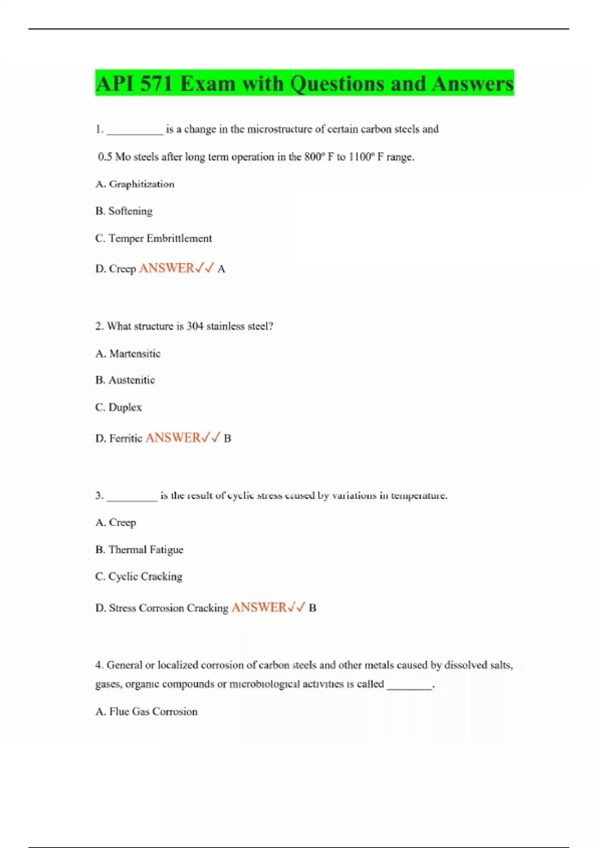 API 571 Exam with Questions and Answers 1. __________ is a change in the microstructure of certain carbon steels and 0.5 Mo steels after long term operation in the 800º F to 1100º F range. A. Graphitization B. Softening C. Temper Embrittlement D. Creep ANSWER A 2. What structure is 304 stainless steel? A. Martensitic B. Austenitic C. Duplex D. Ferritic ANSWER B 3. _________ is the result of cyclic stress caused by variations in temperature. A. Creep B. Thermal Fatigue C. Cyclic Cracking D. Stress Corrosion Cracking ANSWER B 4. General or localized corrosion of carbon steels and other metals caused by dissolved salts, gases, organic compounds or microbiological activities is called ________. A. Flue Gas Corrosion