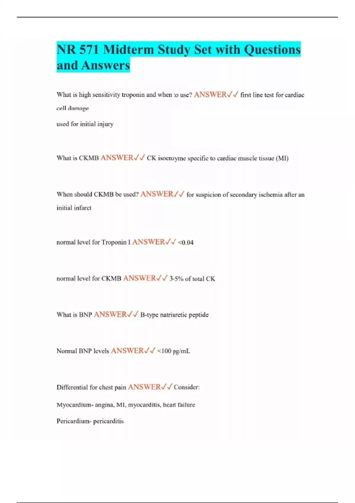 NR 571 Midterm Study Set with Questions and Answers What is high sensitivity troponin and when to use? ANSWER first line test for cardiac cell damage used for initial injury What is CKMB ANSWER CK isoenzyme specific to cardiac muscle tissue (MI) When should CKMB be used? ANSWER for suspicion of secondary ischemia after an initial infarct normal level for Troponin I ANSWER <0.04 normal level for CKMB ANSWER 3-5% of total CK What is BNP ANSWER B-type natriuretic peptide Normal BNP levels ANSWER <100 pg/mL Differential for chest pain ANSWER Consider: Myocardium- angina, MI, myocarditis, heart failure Pericardium- pericarditis