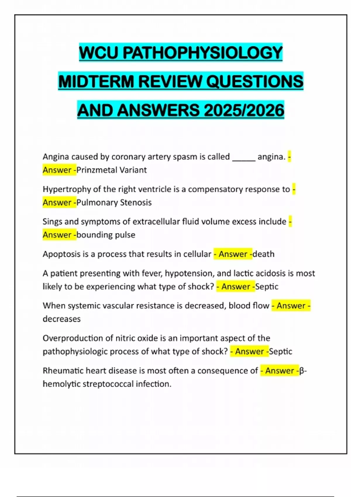 WCU PATHOPHYSIOLOGY MIDTERM REVIEW QUESTIONS AND ANSWERS 2025/2026 Angina caused by coronary artery spasm is called _____ angina. - Answer -Prinzmetal Variant Hypertrophy of the right ventricle is a compensatory response to - Answer -Pulmonary Stenosis Sings and symptoms of extracellular fluid volume excess include - Answer -bounding pulse Apoptosis is a process that results in cellular - Answer -death A patient presenting with fever, hypotension, and lactic acidosis is most likely to be experiencing what type of shock? - Answer -Septic When systemic vascular resistance is decreased, blood flow - Answer - decreases Overproduction of nitric oxide is an important aspect of the pathophysiologic process of what type of shock? - Answer -Septic Rheumatic heart disease is most often a consequence of - Answer -β- hemolytic streptococcal infection.A patient with heart failure who reports intermittent shortness of breath during the night is experiencing - Answer -paroxysmal nocturnal dyspnea The effects of histamine release include - Answer -increased vascular permeability A diagnostic laboratory finding in myeloma is - Answer -Bence Jones proteins in the urine Emesis causes - Answer -metabolic alkalosis Necrotic death of brain tissue usually produces _________ necrosis - Answer -liquefactive Metabolic alkalosis is often accompanied by - Answer -hypokalemia A patient diagnosed with chronic compensated heart failure reports that, "My feet swell if I eat salt but I don't understand why" The nurse's best response is - Answer -"Salt holds water in your blood and makes more pressure against your blood vessels, so fluid leaks out into your tissues and makes them swell." Cancer grading is based on - Answer -cell differentiation The most common primary immune deficiency that affects only B cells is - Answer -Selective IgA Which dysrhythmia is thought to be associated with reentrant mechanisms? - Answer -Preexcitation syndrome tachycardia (WolfParkinson-White syndrome)A 3-year old boy who exhibits prolonged bleeding after minor trauma and a prolonged aPTT, bu a normal platelet count, is likely to be diagnosed with - Answer -Hemophilia The majority of cardiac cells that die after myocardial infarction do so because of - Answer -apoptosis Dramatic hypotension sometimes accompanies type I hypersensitivity reactions because - Answer -massive histamine release from mast cells leads to vasodilation What results when systemic blood pressure is incre