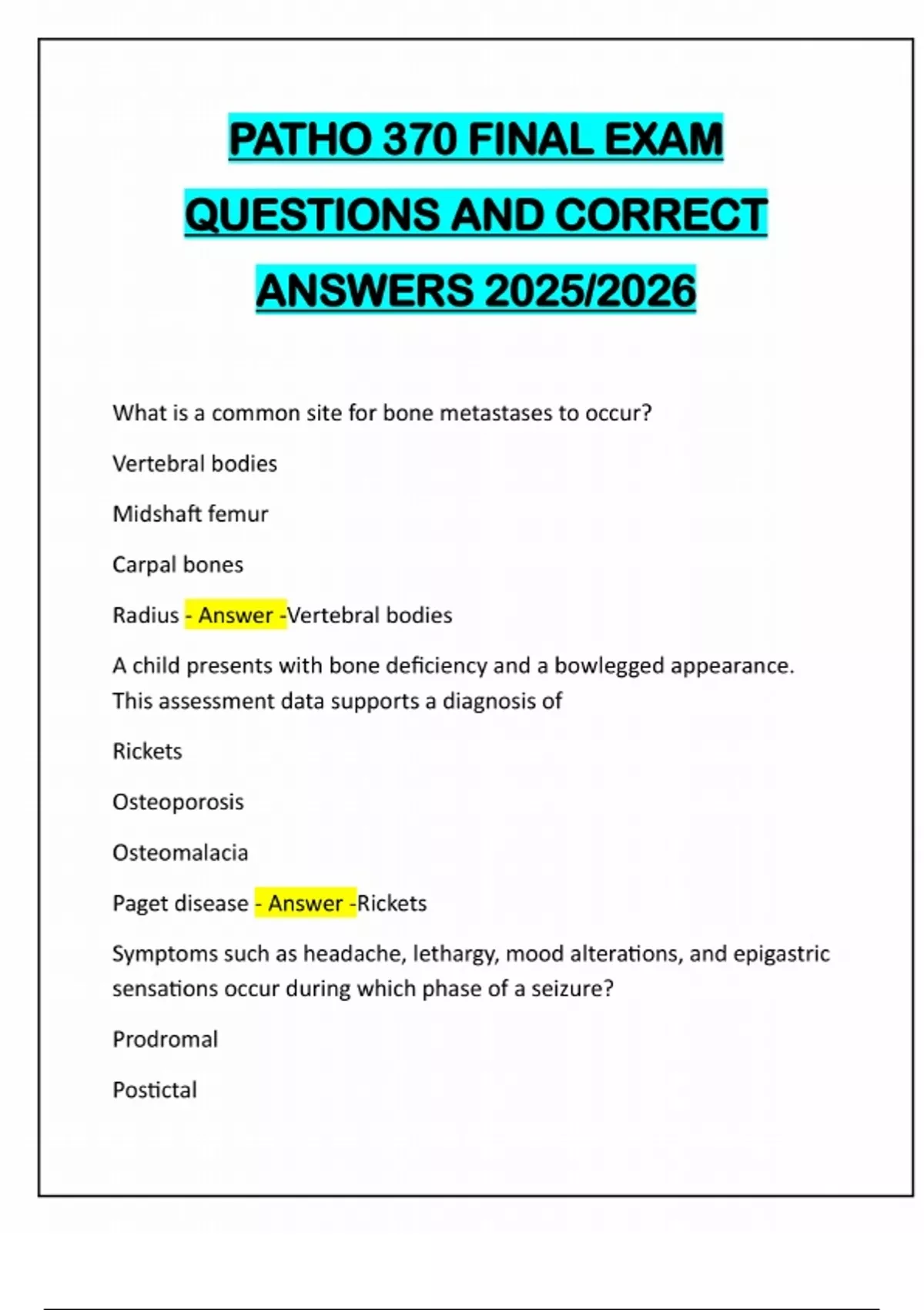 PATHO 370 FINAL EXAM QUESTIONS AND CORRECT ANSWERS 2025/2026 What is a common site for bone metastases to occur? Vertebral bodies Midshaft femur Carpal bones Radius - Answer -Vertebral bodies A child presents with bone deficiency and a bowlegged appearance. This assessment data supports a diagnosis of Rickets Osteoporosis Osteomalacia Paget disease - Answer -Rickets Symptoms such as headache, lethargy, mood alterations, and epigastric sensations occur during which phase of a seizure? Prodromal PostictalComplex Status epilepticus - Answer -Prodromal Which of the following is true about ischemic stroke? (Select all that apply) Has risk factors that include atherosclerosis Can be a result of a hypercoagulable state Often caused by emboli from the basilar arteries Results from hemorrhage into brain tissue Is associated with acute hypertension - Answer -Has risk factors that include atherosclerosis Can be a result of a hypercoagulable state Which is a pathophysiologic change that is consistent with Alzheimer's disease? (Select all that apply) Amyloid plaques Epileptogenic focus Focal cerebral infarct Neurofibrillary tangles Abnormal serotonin system - Answer -Amyloid plaques Neurofibrillary tangles Which is associated with early increased intracranial pressure? Inability to moveUnresponsiveness Inability to verbalize Headache - Answer -Headache A 6-year-old boy presents with polyarthritis. His parents report no past medical history except for a sore throat 6 weeks previously. On physical exam a murmur is noted. The assessment data supports a diagnosis of Acute Rheumatic Fever Rheumatoid arthritis Lyme disease Reiter syndrome - Answer -Acute Rheumatic Fever