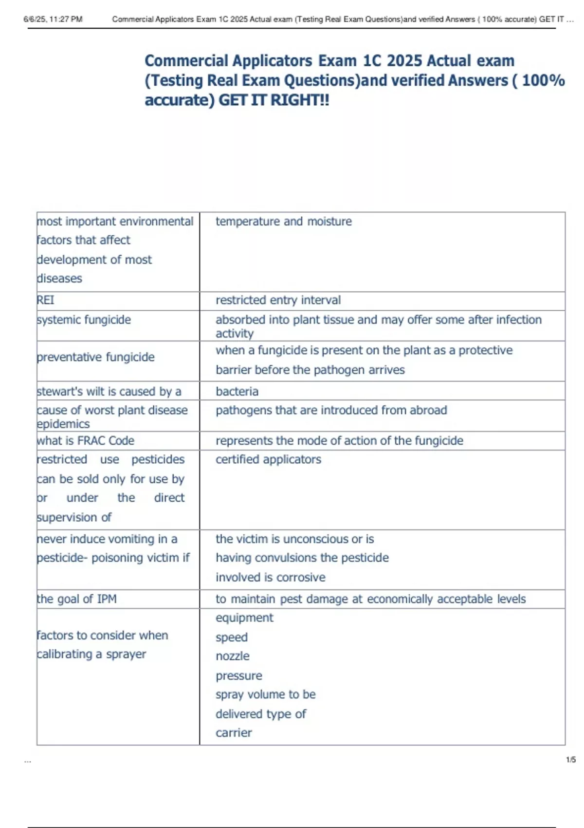 , 6/6/25, 11:27 PM Commercial Applicators Exam 1C 2025 Actual exam (Testing Real Exam Questions)and verified Answers ( 100% accurate) GET IT …