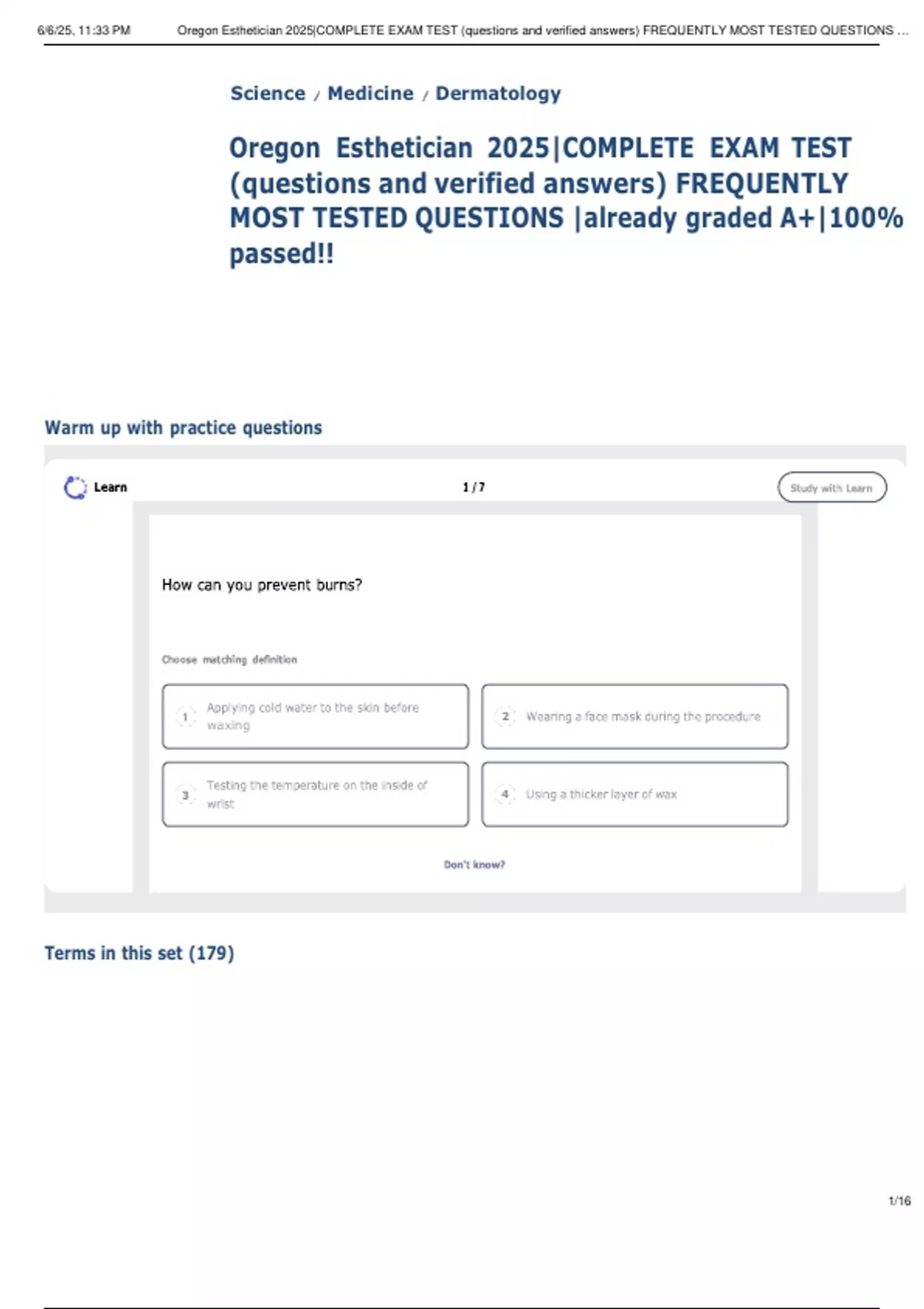 , 6/6/25, 11:33 PM Oregon Esthetician 2025|COMPLETE EXAM TEST (questions and verified answers) FREQUENTLY MOST TESTED QUESTIONS …