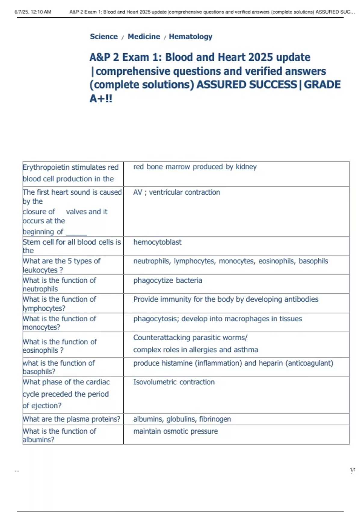 , 6/7/25, 12:10 AM A&P 2 Exam 1: Blood and Heart 2025 update |comprehensive questions and verified answers (complete solutions) ASSURED SUC…