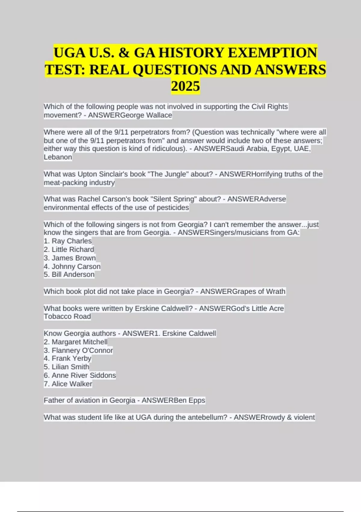Which of the following people was not involved in supporting the Civil Rights movement? - ANSWERGeorge Wallace Where were all of the 9/11 perpetrators from? (Question was technically "where were all but one of the 9/11 perpetrators from" and answer would include two of these answers; either way this question is kind of ridiculous). - ANSWERSaudi Arabia, Egypt, UAE, Lebanon What was Upton Sinclair's book "The Jungle" about? - ANSWERHorrifying truths of the meat-packing industry What was Rachel Carson's book "Silent Spring" about? - ANSWERAdverse environmental effects of the use of pesticides Which of the following singers is not from Georgia? I can't remember the answer...just know the singers that are from Georgia. - ANSWERSingers/musicians from GA: 1. Ray Charles 2. Little Richard 3. James Brown 4. Johnny Carson 5. Bill Anderson Which book plot did not take place in Georgia? - ANSWERGrapes of Wrath What books were written by Erskine Caldwell? - ANSWERGod's Little Acre Tobacco Road