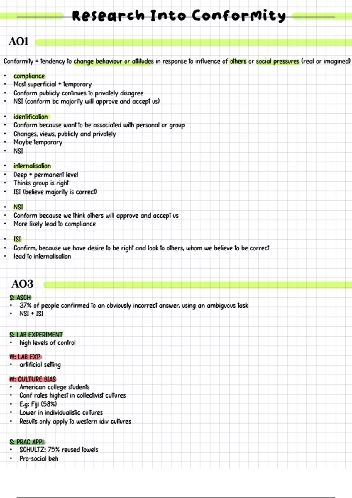 Conformity = tendency to change behaviour or attitudes in response to influence of others or social pressures (real or imagined)