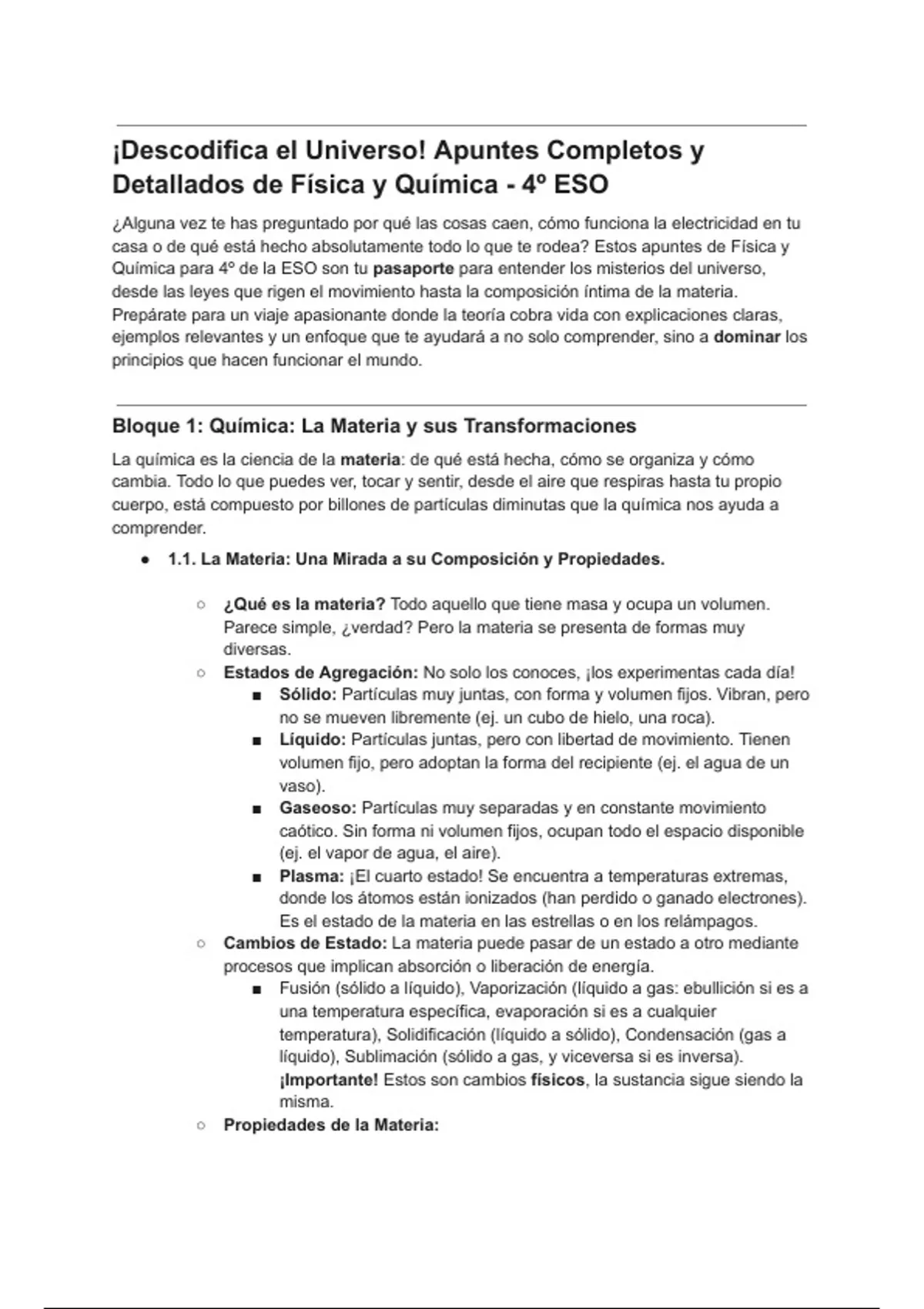 Apuntes detallados física y química sobre el curso de 4 de la eso