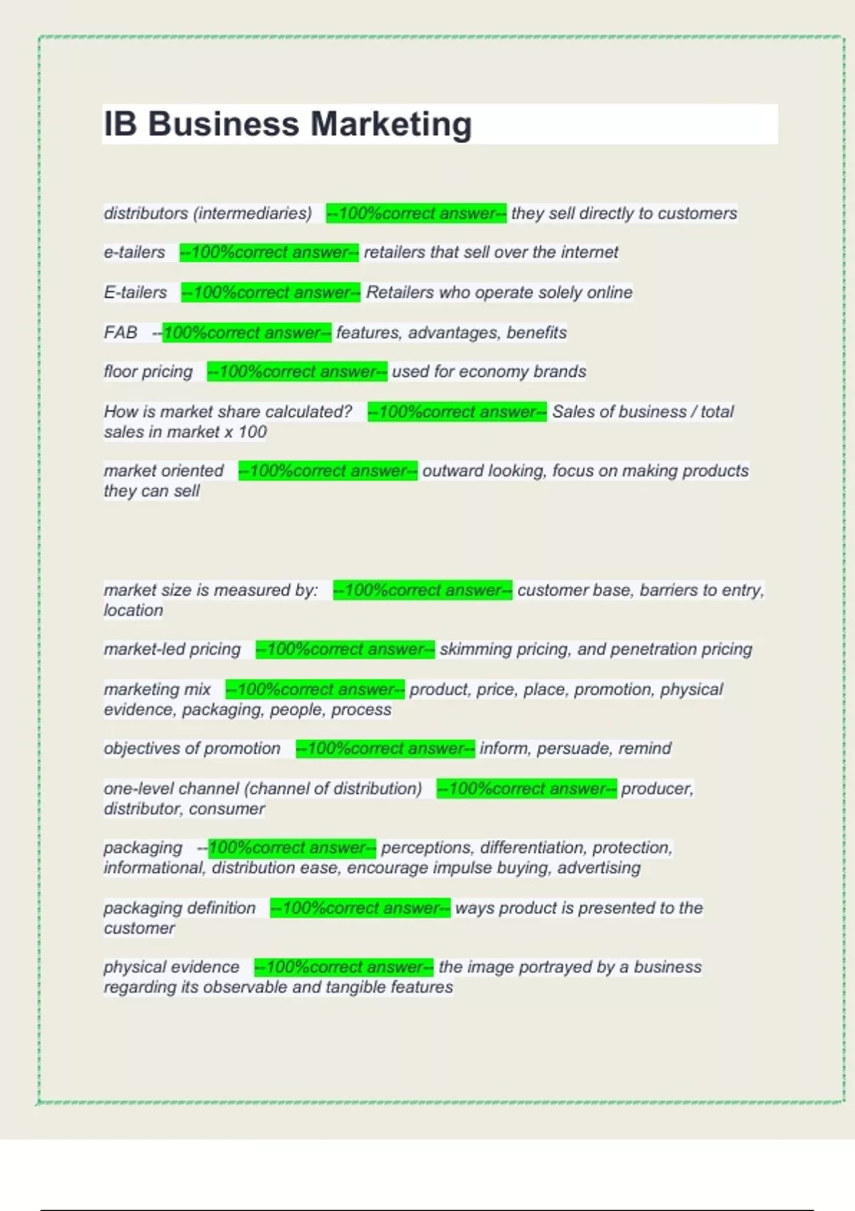 marketing mix --100%correct answer-- product, price, place, promotion, physical