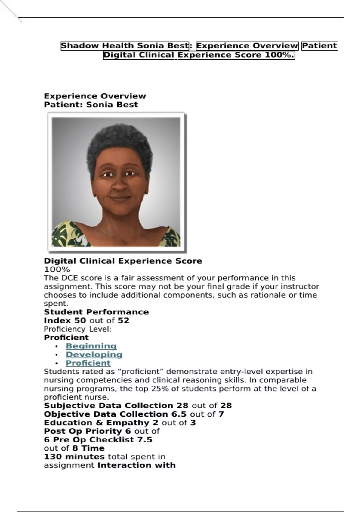 Shadow Health Sonia Best: Experience Overview Patient Digital Clinical Experience Score 100%.