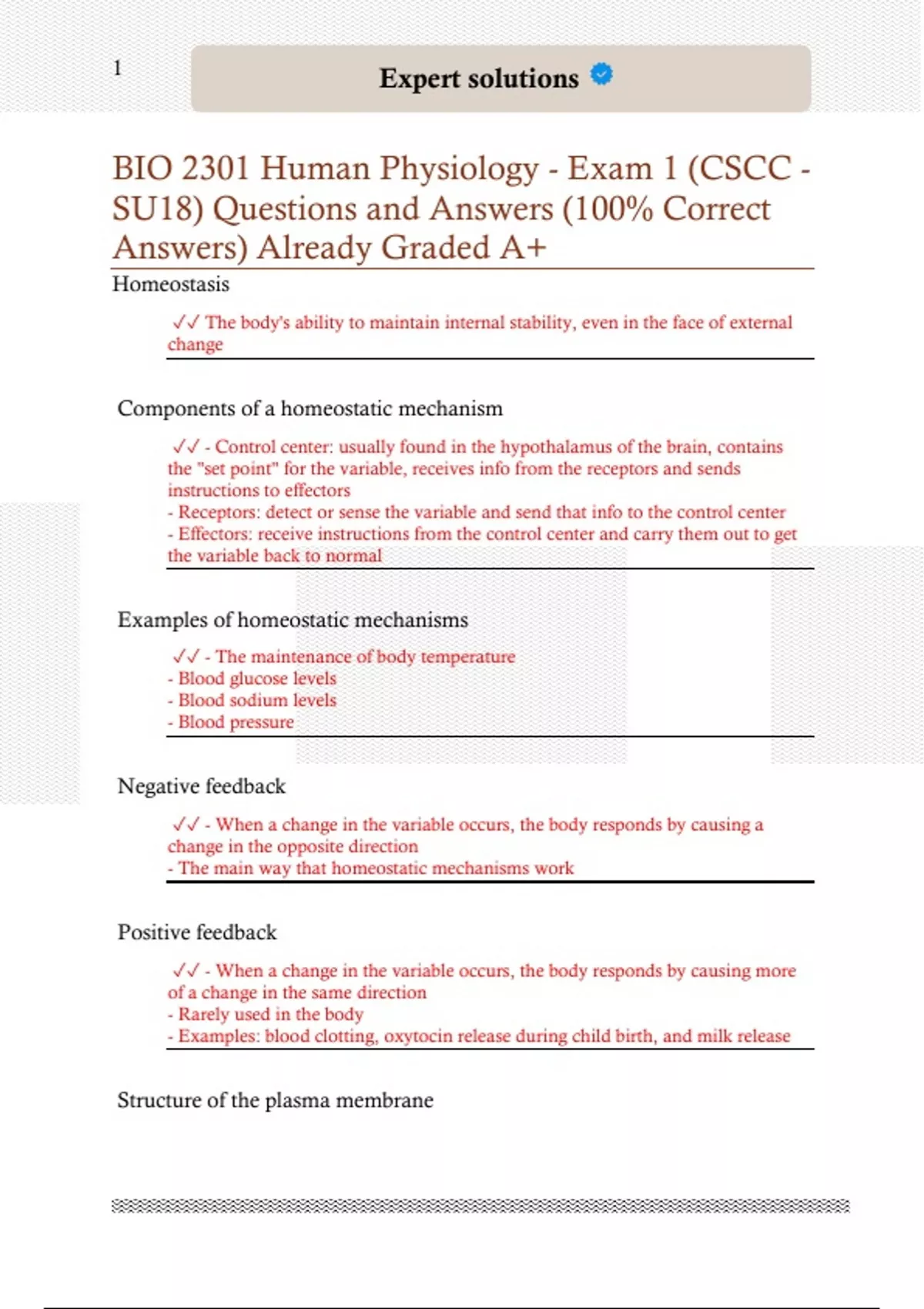 BIO 2301 Human Physiology - Exam 1 (CSCC - SU18) Questions and Answers (100% Correct Answers) Already Graded A+