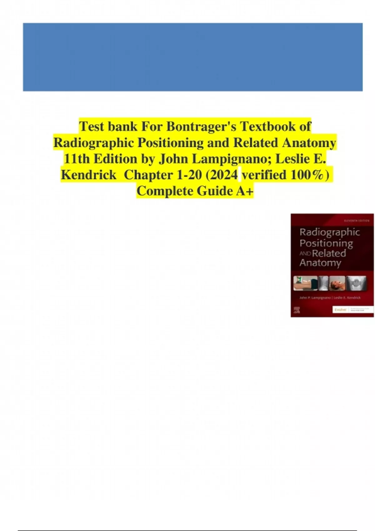 Prepare confidently for radiography exams with this Test Bank for Bontrager’s Textbook of Radiographic Positioning and Related Anatomy, 11th Edition by Lampignano. Includes hundreds of multiple-choice, positioning scenarios, and image-based questions with answers—perfect for radiologic technology courses and ARRT exam prep.