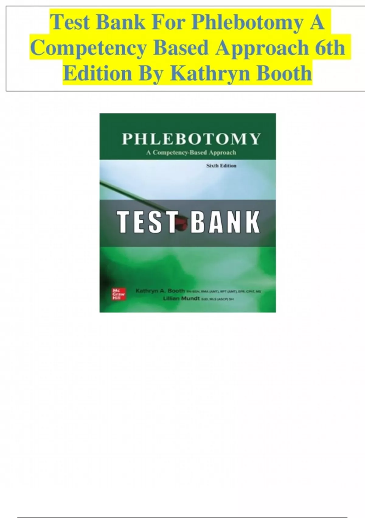 Master your phlebotomy course with this comprehensive Test Bank for Phlebotomy: A Competency-Based Approach, 6th Edition by Kathryn Booth. Includes hundreds of multiple-choice, true/false, and scenario-based questions with correct answers. Perfect for classroom quizzes, certification prep, and healthcare training.