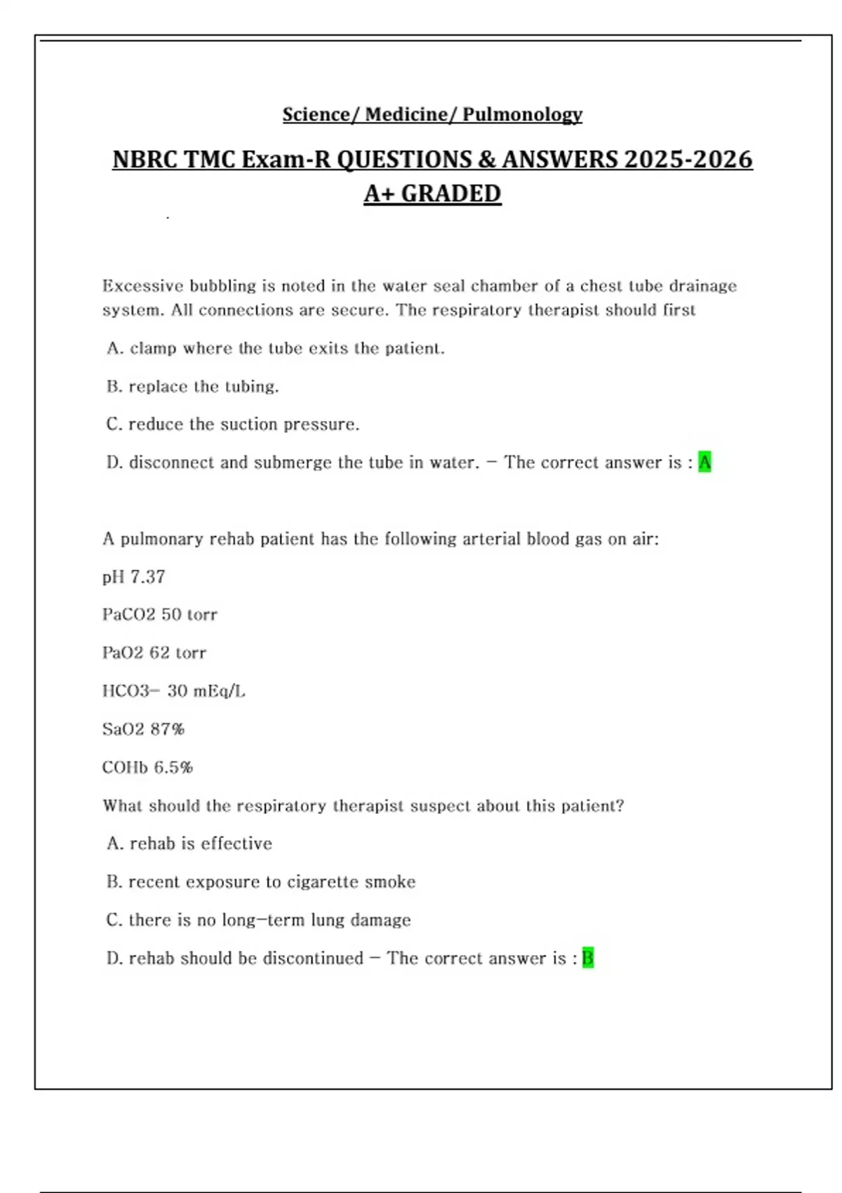 NBRC TMC Exam-R QUESTIONS & ANSWERS A+ GRADED Excessive bubbling is noted in the water seal chamber of a chest tube drainage system. All connections are secure. The respiratory therapist should first A. clamp where the tube exits the patient. B. replace the tubing. C. reduce the suction pressure. D. disconnect and submerge the tube in water. - The correct answer is : A A pulmonary rehab patient has the following arterial blood gas on air: pH 7.37 PaCO2 50 torr PaO2 62 torr HCO3- 30 mEq/L SaO2 87% COHb 6.5% What should the respiratory therapist suspect about this patient? A. rehab is effective B. recent exposure to cigarette smoke C. there is no long-term lung damage D. rehab should be discontinued - The correct answer Continues...