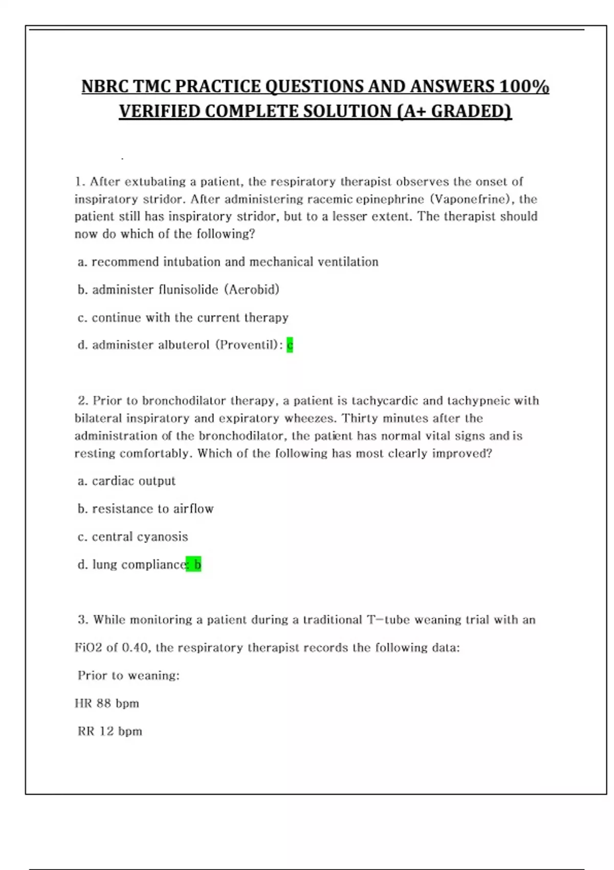 NBRC TMC PRACTICE QUESTIONS AND ANSWERS 100% VERIFIED COMPLETE SOLUTION (A+ GRADED) 1. After extubating a patient, the respiratory therapist observes the onset of inspiratory stridor. After administering racemic epinephrine (Vaponefrine), the patient still has inspiratory stridor, but to a lesser extent. The therapist should now do which of the following? a. recommend intubation and mechanical ventilation b. administer flunisolide (Aerobid) c. continue with the current therapy d. administer albuterol (Proventil): c 2. Prior to bronchodilator therapy, a patient is tachycardic and tachypneic with bilateral inspiratory and expiratory wheezes. Thirty minutes after the administration of the bronchodilator, the patient has normal vital signs and is resting comfortably. Which of the following has most clearly improved? a. cardiac output b. resistance to airflow c. central cyanosis d. lung compliance: b 3. While monitoring a patient during a traditional T-tube weaning trial with an FiO2 of 0.40, the respiratory therapist records the following data: