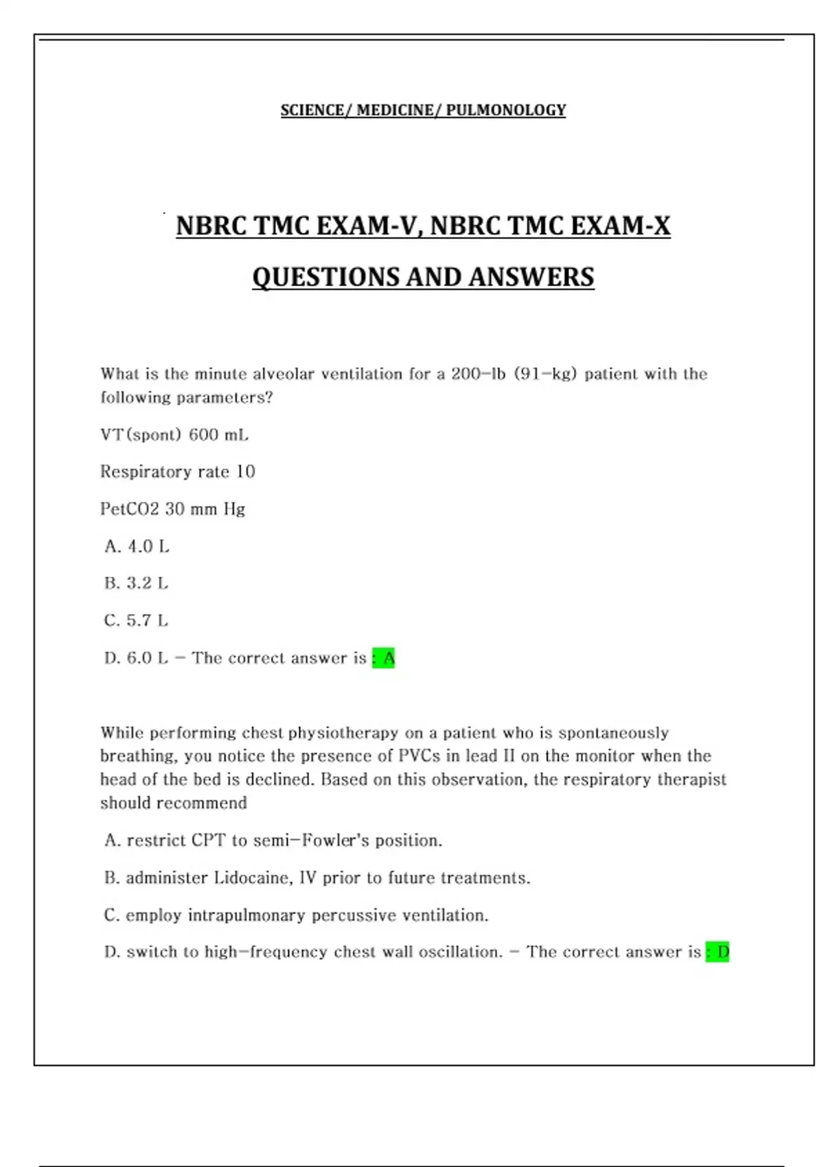 NBRC TMC EXAM-V, NBRC TMC EXAM-X QUESTIONS AND ANSWERS What is the minute alveolar ventilation for a 200-lb (91-kg) patient with the following parameters? VT(spont) 600 mL Respiratory rate 10 PetCO2 30 mm Hg A. 4.0 L B. 3.2 L C. 5.7 L D. 6.0 L - The correct answer is : A While performing chest physiotherapy on a patient who is spontaneously breathing, you notice the presence of PVCs in lead II on the monitor when the head of the bed is declined. Based on this observation, the respiratory therapist should recommend A. restrict CPT to semi-Fowler's position. B. administer Lidocaine, IV prior to future treatments. C. employ intrapulmonary percussive ventilation. D. switch to high-frequency chest wall oscillation. - The correct answer is : D A 'flat' sound is heard while performing diagnostic chest percussion. This sound is mostly likely observed when percussion is done over