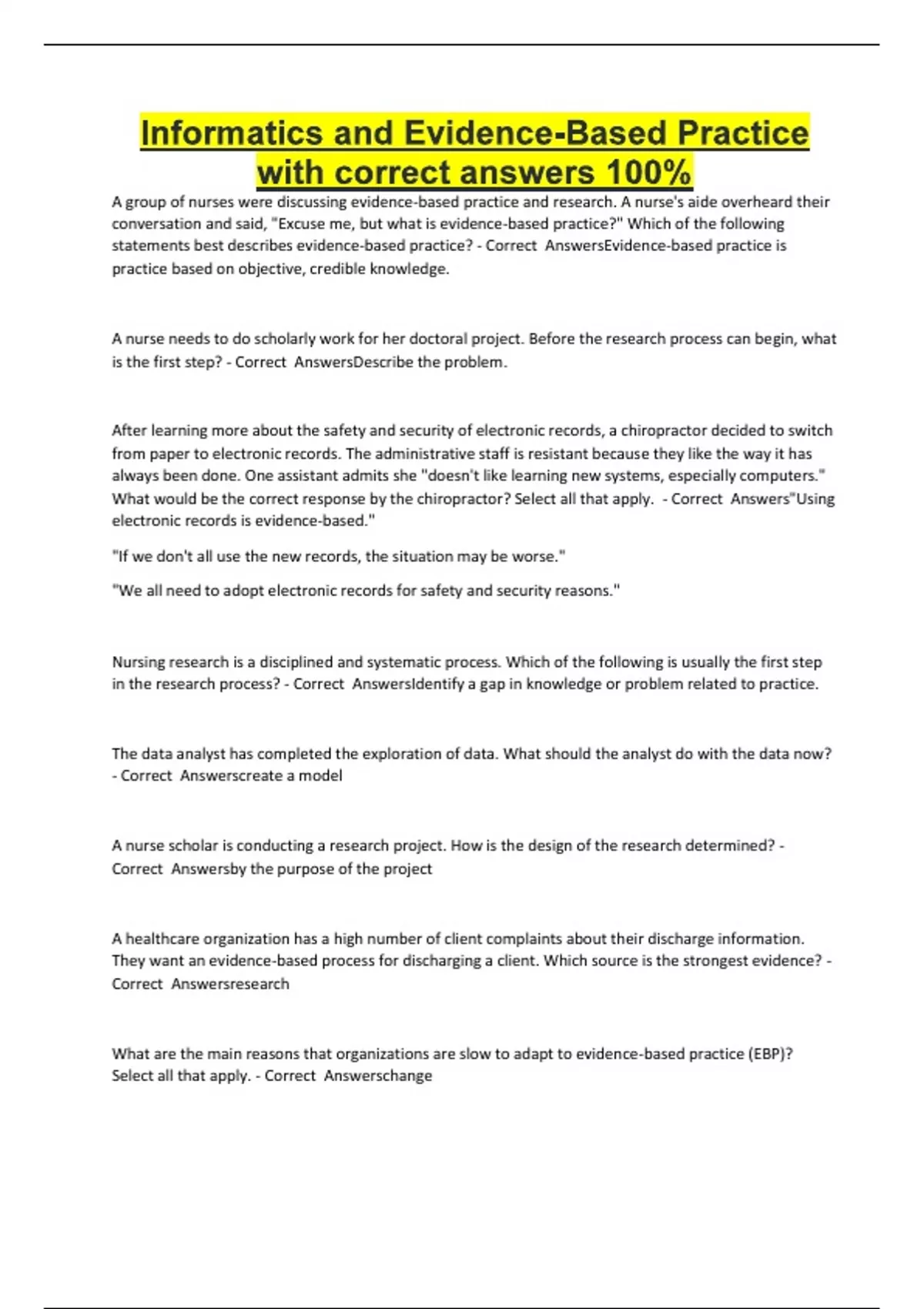 Informatics and Evidence-Based Practice with correct answers 100% A group of nurses were discussing evidence-based practice and research. A nurse's aide overheard their conversation and said, "Excuse me, but what is evidence-based practice?" Which of the following statements best describes evidence-based practice? - Correct AnswersEvidence-based practice is practice based on objective, credible knowledge. A nurse needs to do scholarly work for her doctoral project. Before the research process can begin, what is the first step? - Correct AnswersDescribe the problem. After learning more about the safety and security of electronic records, a chiropractor decided to switch from paper to electronic records. The administrative staff is resistant because they like the way it has always been done. One assistant admits she "doesn't like learning new systems, especially computers." What would be the correct response by the chiropractor? Select all that apply. - Correct Answers"Using electronic records is evidence-based." "If we don't all use the new records, the situation may be worse." "We all need to adopt electronic records for safety and security reasons." Nursing research is a disciplined and systematic process. Which of the following is usually the first step in the research process? - Correct AnswersIdentify a gap in knowledge or problem related to practice. The data analyst has completed the exploration of data. What should the analyst do with the data now? - Correct Answerscreate a model A nurse scholar is conducting a research project. How is the design of the research determined? - Correct Answersby the purpose of the project A healthcare organization has a high number of client complaints about their discharge information. They want an evidence-based process for discharging a client. Which source is the strongest evidence? - Correct Answersresearch What are the main reasons that organizations are slow to adapt to evidence-based practice (EBP)? Select all that apply. - Correct Answerschange authority time Before starting, the committee needs to review the steps in the research process. Place the following research step in the correct order. - Correct Answersdefining developing designing implementing analyzing disseminationg application The next step of the plan is to gather information. The committee is interested in all data related to current client education practices as well as client and staff feedback on the education process. They also want to know what is considered "quality online education." The analysts suggest the process of data mining. Why is this method of data collection appropriate? - Correct Answersthe amount The design of this project is a mix between qualitative and quantitative data sources. Place the data sources in the correct categories. - Correct AnswersQualitative: descriptions list of health opinions Quantitative: cost number During one of the first meetings after the data mining started, a staff member asked how they knew for sure that the data collected was "quality" evidence? The analyst assured the staff member and committee that it was. How is quality determined? - Correct AnswersUse metrics such as consistency and integrity.