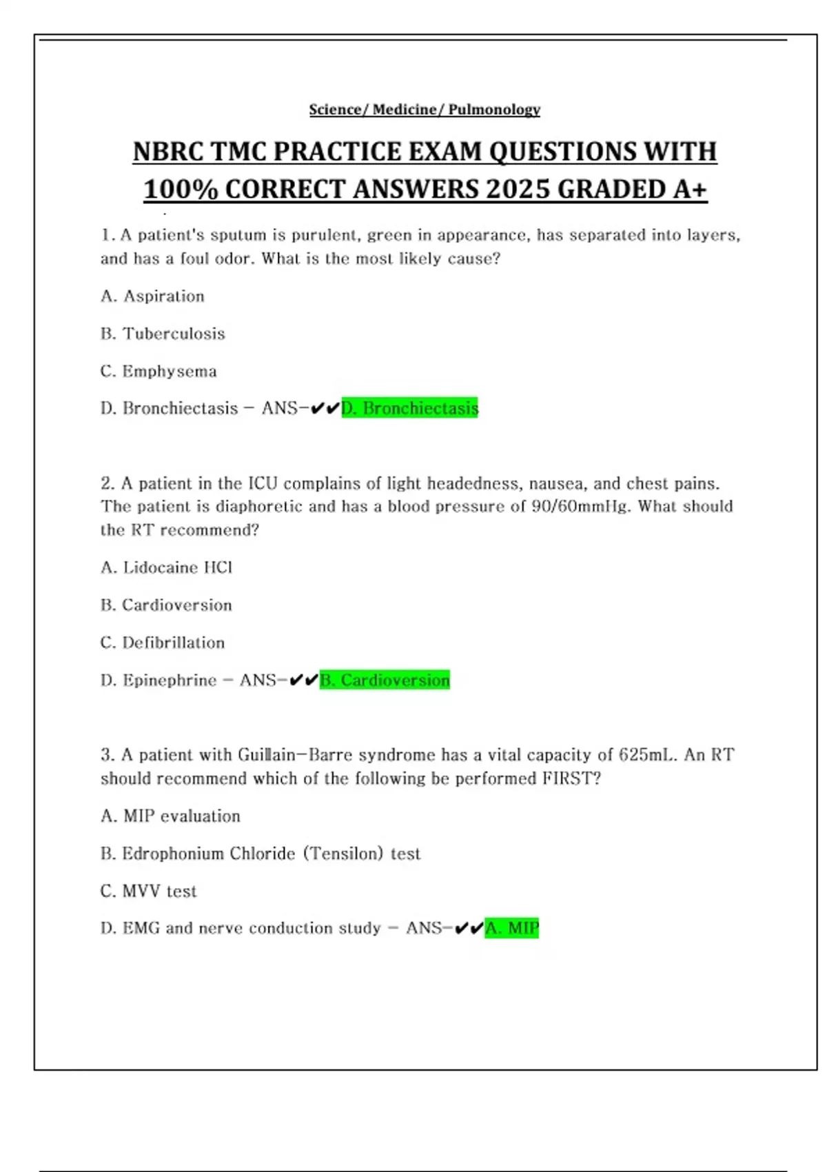 NBRC TMC PRACTICE EXAM QUESTIONS WITH 100% CORRECT ANSWERS 2025 GRADED A+ 1. A patient's sputum is purulent, green in appearance, has separated into layers, and has a foul odor. What is the most likely cause? A. Aspiration B. Tuberculosis C. Emphysema D. Bronchiectasis - ANS-D. Bronchiectasis 2. A patient in the ICU complains of light headedness, nausea, and chest pains. The patient is diaphoretic and has a blood pressure of 90/60mmHg. What should the RT recommend? A. Lidocaine HCl B. Cardioversion C. Defibrillation D. Epinephrine - ANS-B. Cardioversion 3. A patient with Guillain-Barre syndrome has a vital capacity of 625mL. An RT should recommend which of the following be performed FIRST? A. MIP evaluation B. Edrophonium Chloride (Tensilon) test C. MVV test D. EMG and nerve conduction study - ANS Continues...