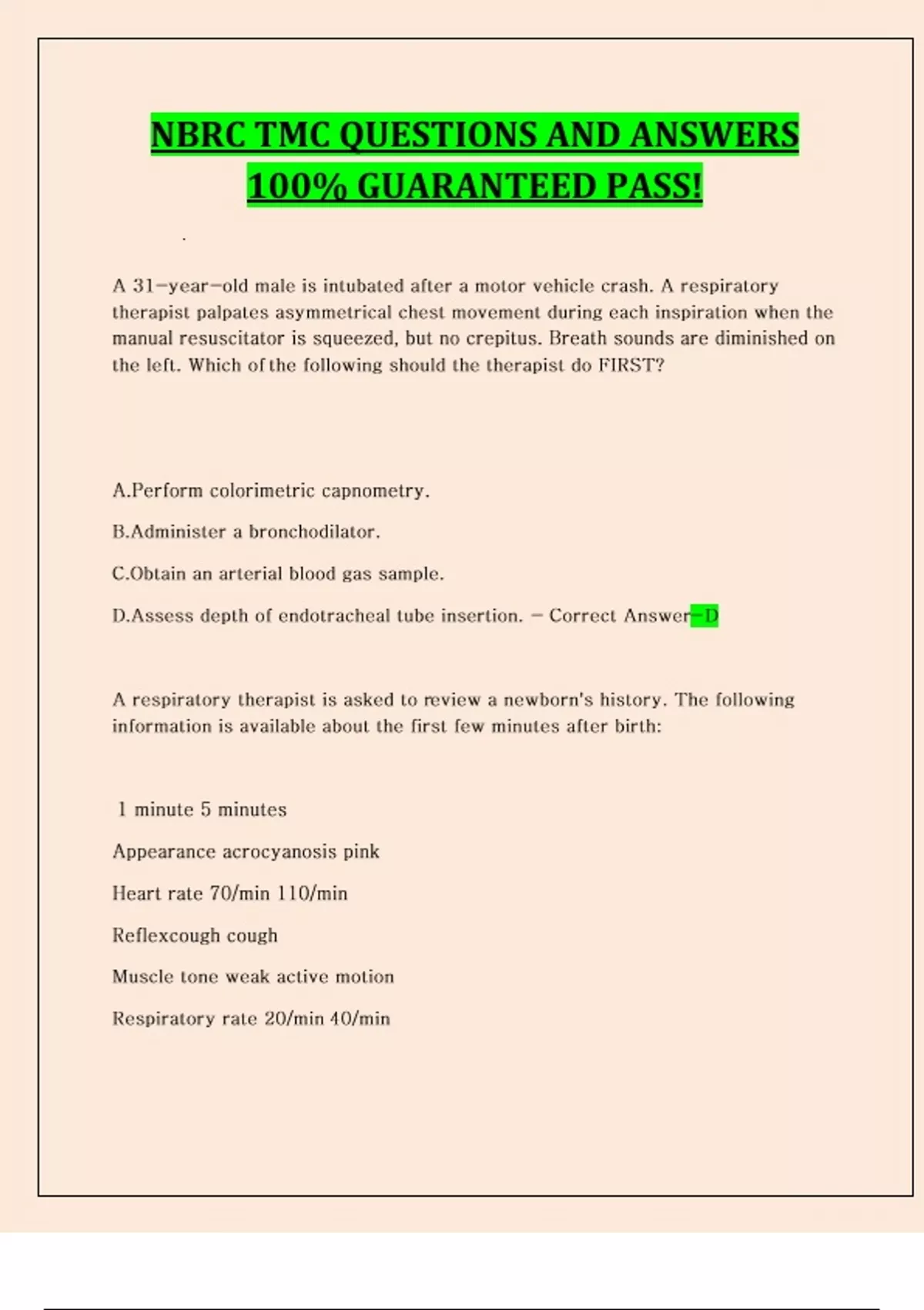 NBRC TMC QUESTIONS AND ANSWERS 100% GUARANTEED PASS! A 31-year-old male is intubated after a motor vehicle crash. A respiratory therapist palpates asymmetrical chest movement during each inspiration when the manual resuscitator is squeezed, but no crepitus. Breath sounds are diminished on the left. Which of the following should the therapist do FIRST? A.Perform colorimetric capnometry. B.Administer a bronchodilator. C.Obtain an arterial blood gas sample. D.Assess depth of endotracheal tube insertion. - Correct Answer-D A respiratory therapist is asked to review a newborn's history. The following information is available about the first few minutes after birth: 1 minute 5 minutes Appearance acrocyanosis pink Heart rate 70/min 110/min Reflexcough cough Muscle tone weak active motion Respiratory rate 20/min 40/min Which of the following APGAR scores should the therapist expect to see for this infant? 1-minute 5-minute 1. 4 8 2. 5 8 3. 6 10 4. 7 10 A.1 B.2 C.3 D.4 - Correct Answer-
