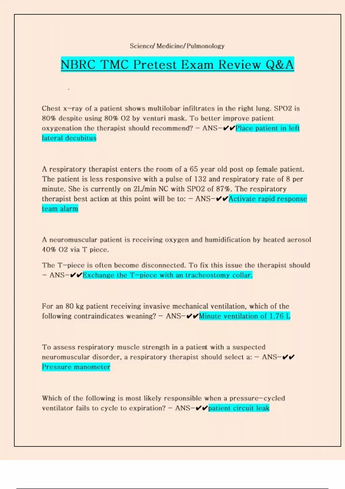 NBRC TMC Pretest Exam Review Q&A Chest x-ray of a patient shows multilobar infiltrates in the right lung. SPO2 is 80% despite using 80% O2 by venturi mask. To better improve patient oxygenation the therapist should recommend? - ANS-Place patient in left lateral decubitus A respiratory therapist enters the room of a 65 year old post op female patient. The patient is less responsive with a pulse of 132 and respiratory rate of 8 per minute. She is currently on 2L/min NC with SPO2 of 87%. The respiratory therapist best action at this point will be to: - ANS-Activate rapid response team alarm A neuromuscular patient is receiving oxygen and humidification by heated aerosol 40% O2 via T piece. The T-piece is often become disconnected. To fix this issue the therapist should - ANS-Exchange the T-piece with an tracheostomy collar. For an 80 kg patient receiving invasive mechanical ventilation, which of the following contraindicates weaning? - ANS-Minute ventilation of 1.76 L To assess respiratory muscle strength in a patient with a suspected neuromuscular disorder, a respiratory therapist should select a:
