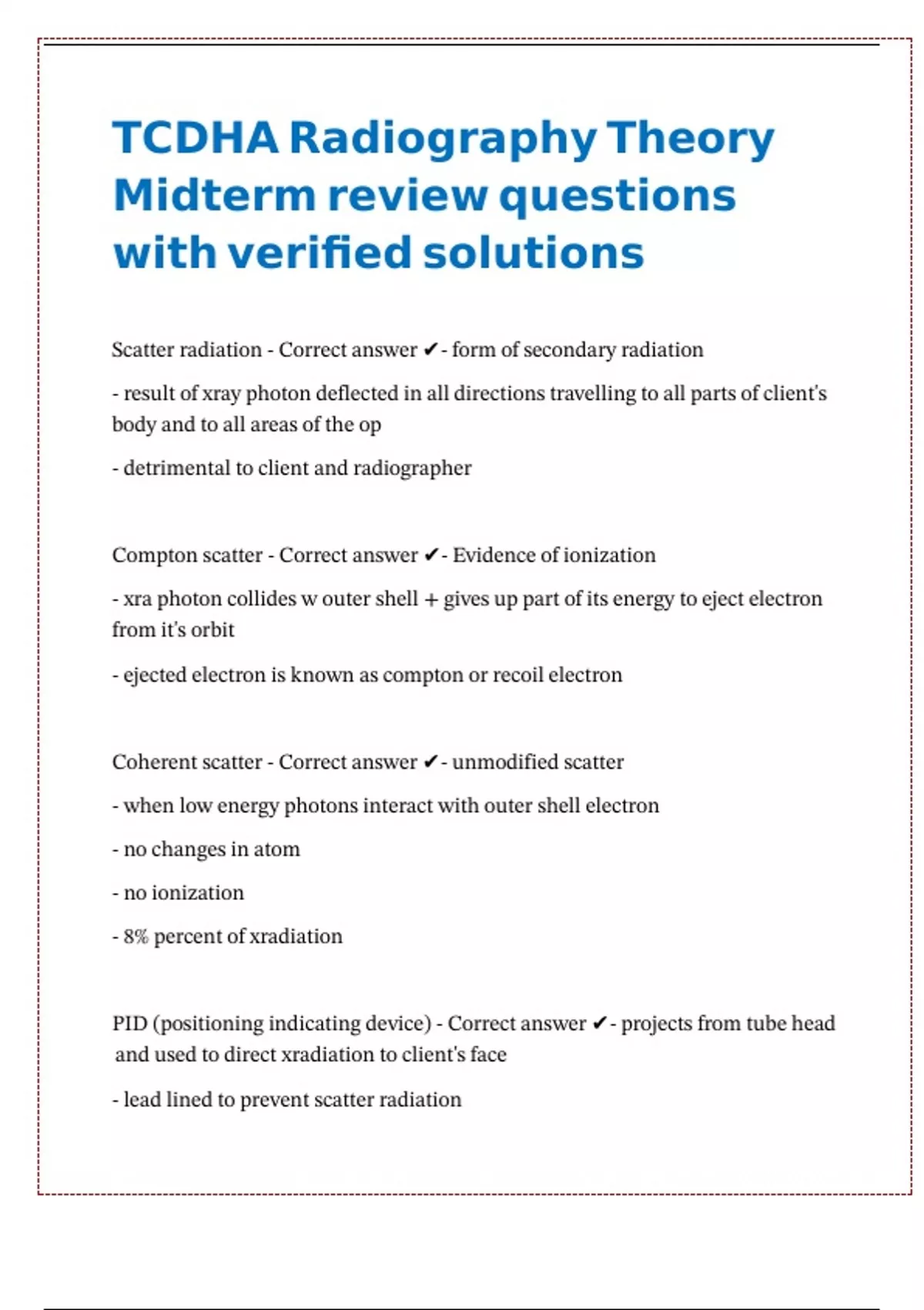 TCDHA Radiography Theory Midterm review questions with verified solutions