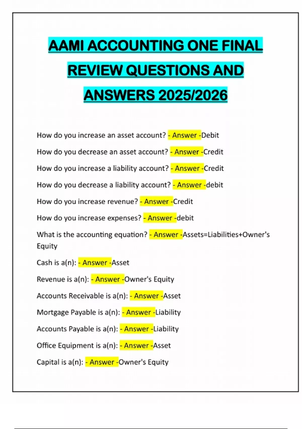 AAMI ACCOUNTING ONE FINAL REVIEW QUESTIONS AND ANSWERS 2025/2026 How do you increase an asset account? - Answer -Debit How do you decrease an asset account? - Answer -Credit How do you increase a liability account? - Answer -Credit How do you decrease a liability account? - Answer -debit How do you increase revenue? - Answer -Credit How do you increase expenses? - Answer -debit What is the accounting equation? - Answer -Assets=Liabilities+Owner's Equity Cash is a(n): - Answer -Asset Revenue is a(n): - Answer -Owner's Equity Accounts Receivable is a(n): - Answer -Asset Mortgage Payable is a(n): - Answer -Liability Accounts Payable is a(n): - Answer -Liability Office Equipment is a(n): - Answer -Asset Capital is a(n): - Answer -Owner's Equity