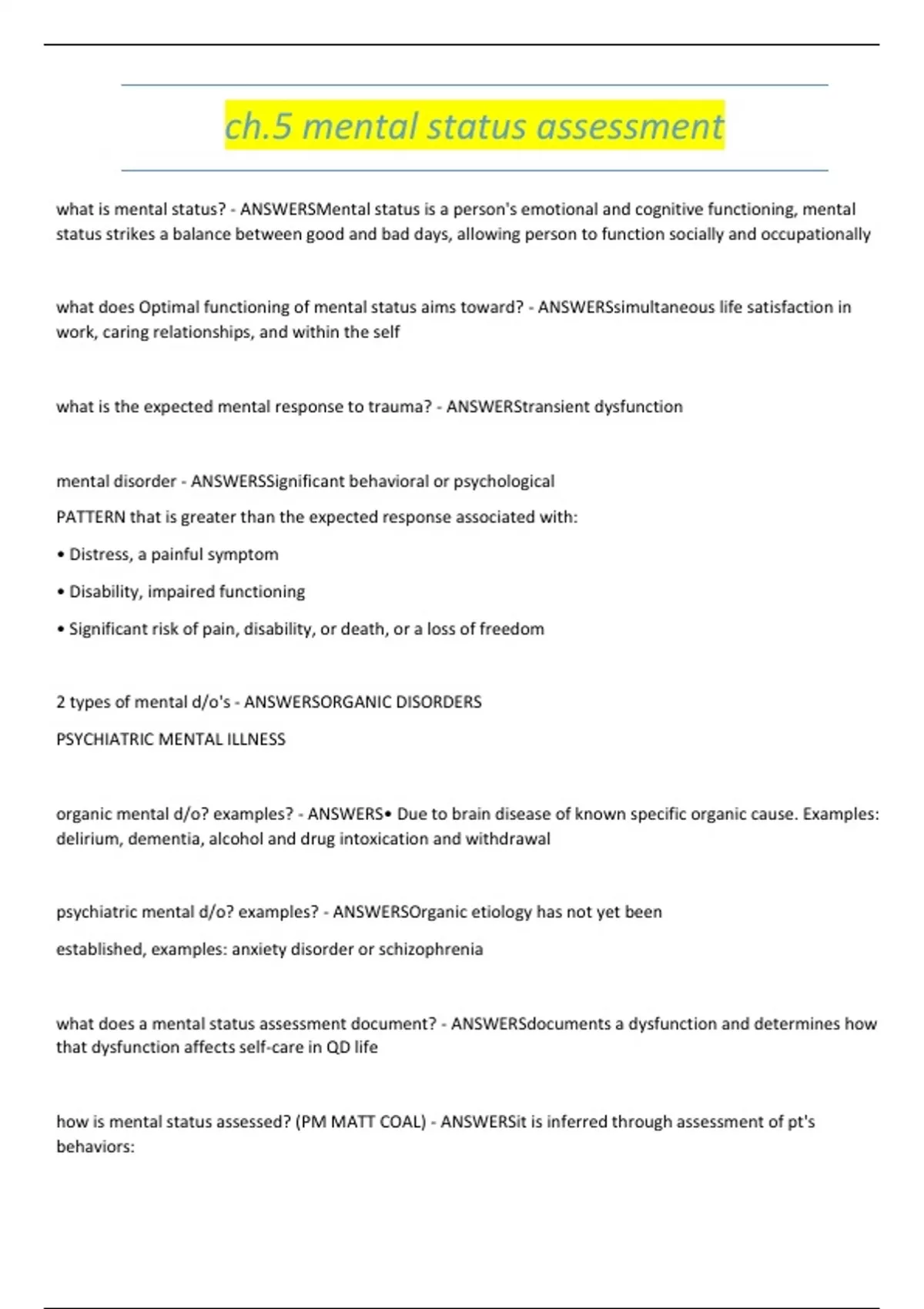 what does a mental status assessment document? - ANSWERSdocuments a dysfunction and determines how