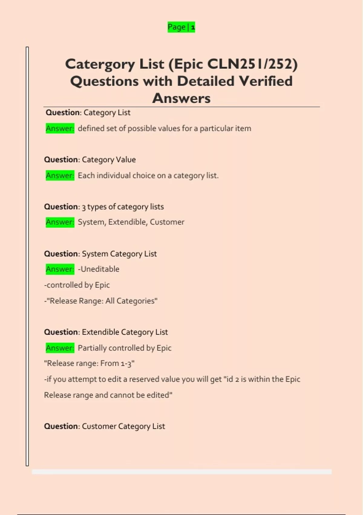 Catergory List (Epic CLN251/252) Questions with Detailed Verified Answers
