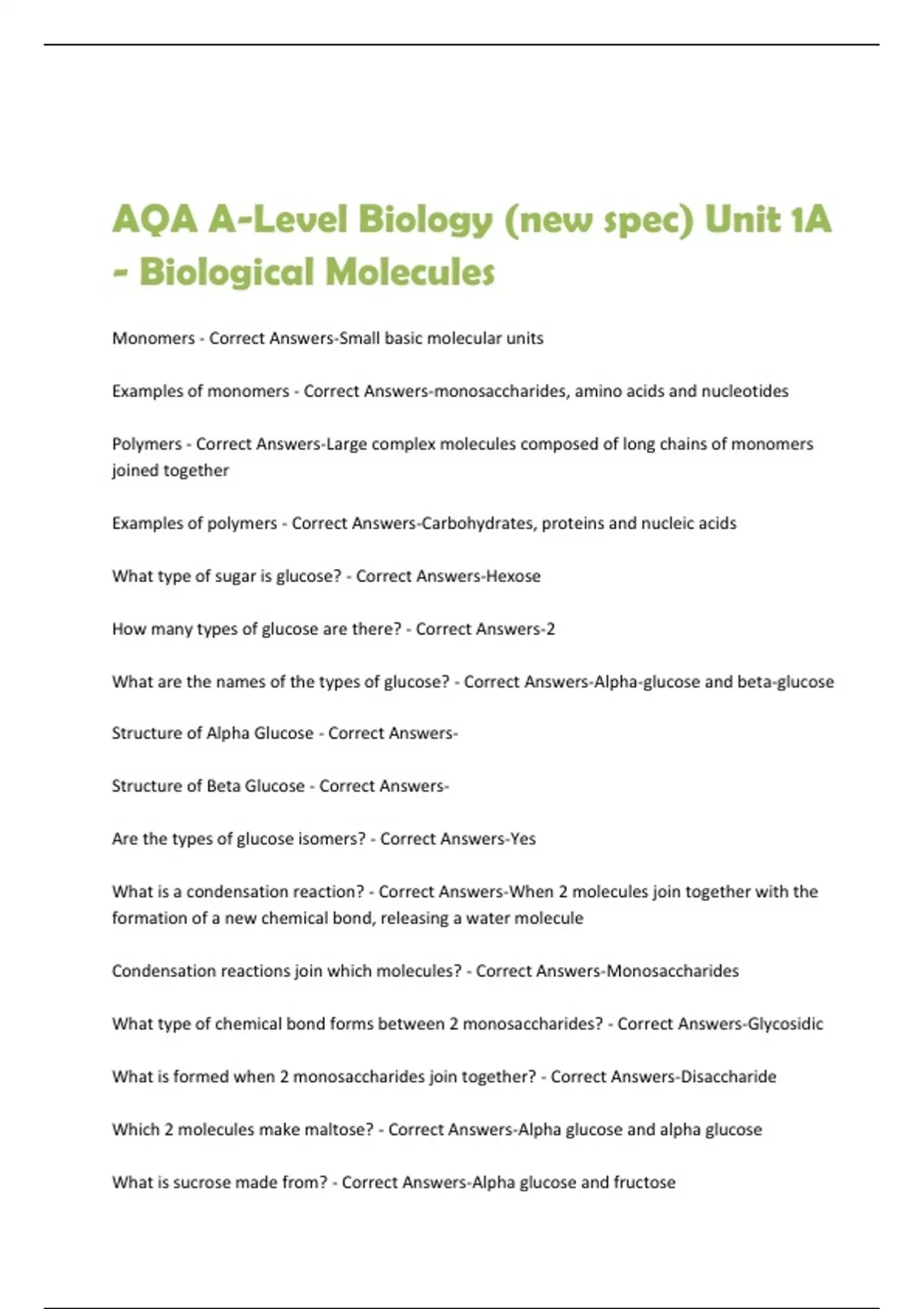 Which 2 molecules make maltose? - Correct Answers-Alpha glucose and alpha glucose