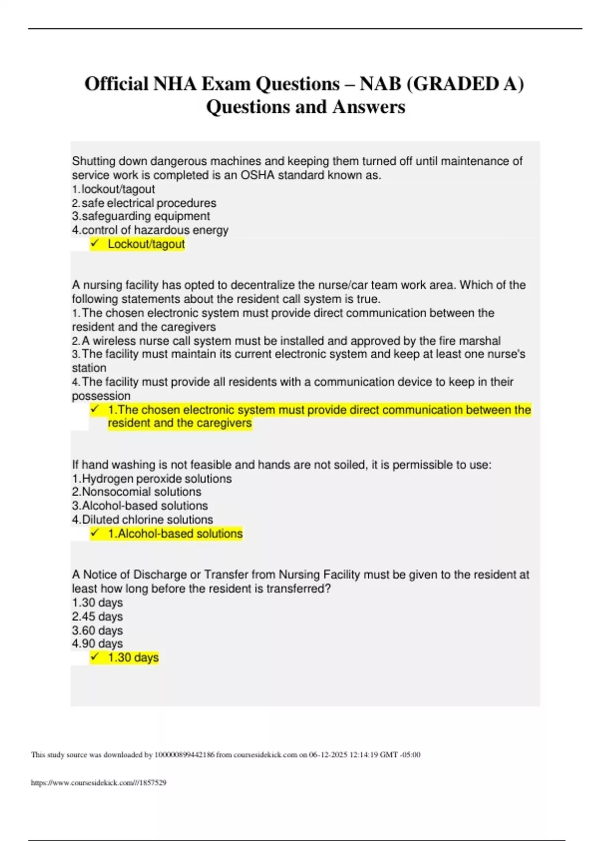 Ace your Official NHA Exam for NAB certification with this high-quality study resource featuring fully verified questions and correct answers. Graded A+, this pack reflects real testing material and includes clear explanations for each question to help you understand essential concepts in long-term care administration, including resident care, human resources, environmental management, and financial operations. Ideal for candidates preparing for NAB licensure exams through the National Healthcare Association. Use this resource for focused exam prep, guaranteed comprehension, and real exam confidence.