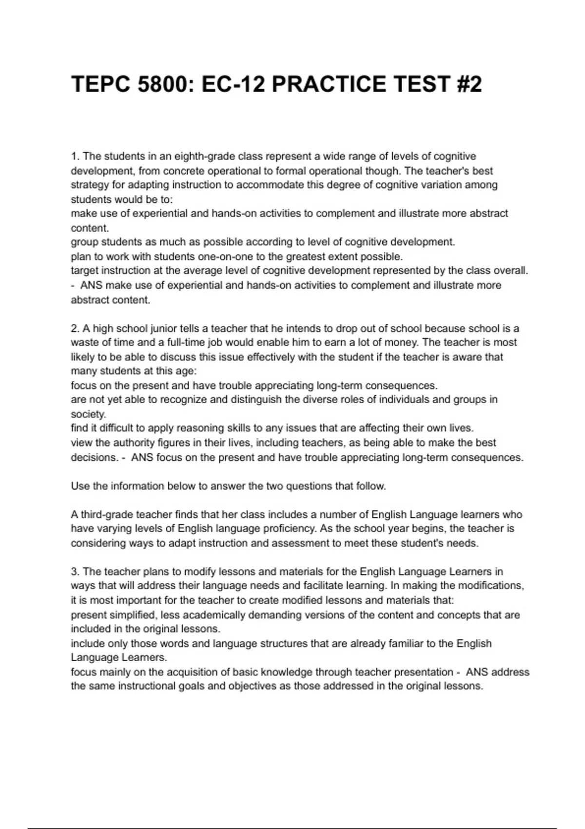 TEPC 5800: EC-12 Practice Test 2– Texas Teacher Certification Preparation, Middle and High School, Full Question & Answer Set (A+ GRADED 100% VERIFIED)