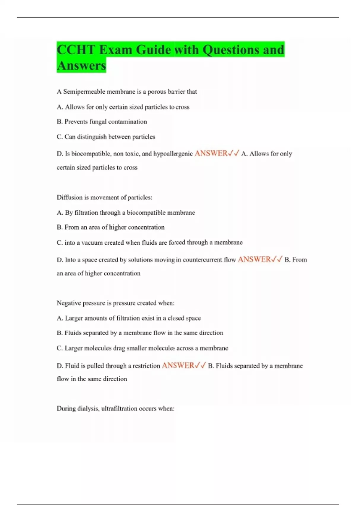 CCHT Exam Guide with Questions and Answers A Semipermeable membrane is a porous barrier that A. Allows for only certain sized particles to cross B. Prevents fungal contamination C. Can distinguish between particles D. Is biocompatible, non toxic, and hypoallergenic ANSWER A. Allows for only certain sized particles to cross Diffusion is movement of particles: A. By filtration through a biocompatible membrane B. From an area of higher concentration C. into a vacuum created when fluids are forced through a membrane D. Into a space created by solutions moving in countercurrent flow ANSWER B. From an area of higher concentration Negative pressure is pressure created when: A. Larger amounts of filtration exist in a closed space B. Fluids separated by a membrane flow in the same direction C. Larger molecules drag smaller molecules across a membrane D. Fluid is pulled through a restriction ANSWER B. Fluids separated by a membrane flow in the same direction During dialysis, ultrafiltration occurs when: