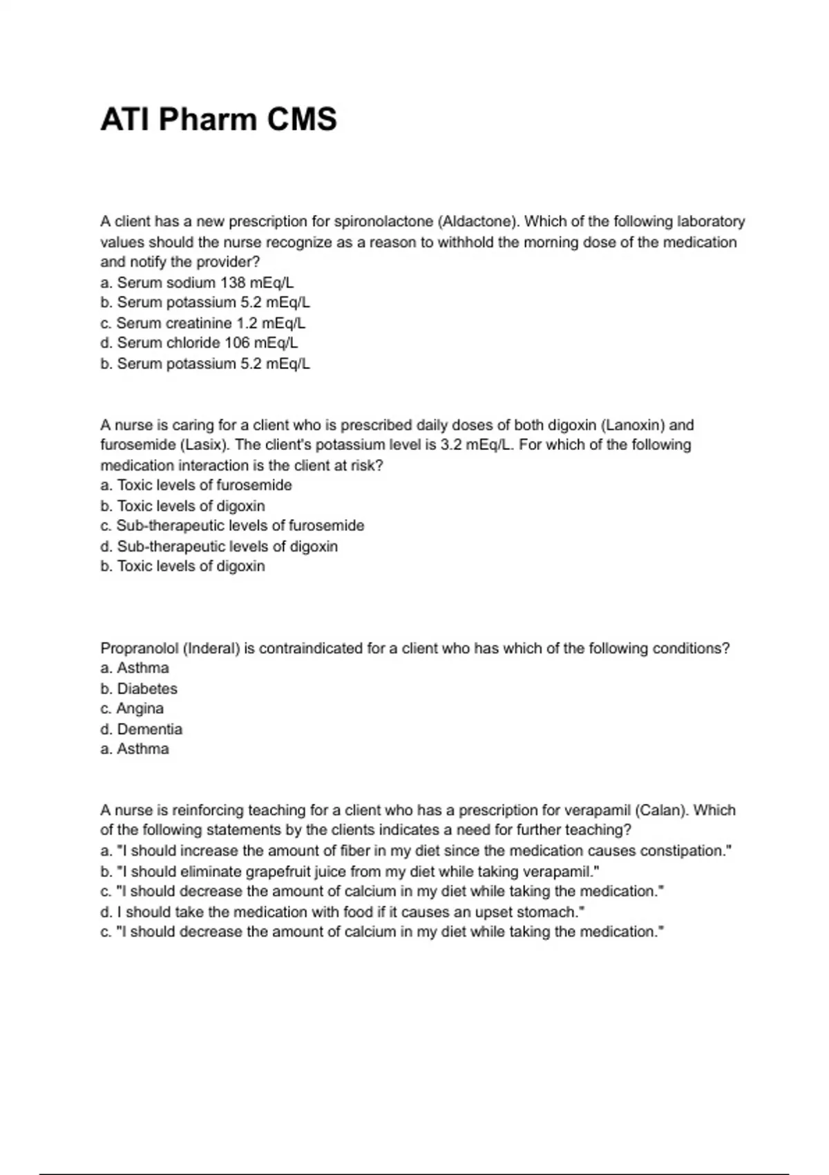 7. A nurse is reinforcing teaching for a client who is prescribed digoxin (Lanoxin). Which of the