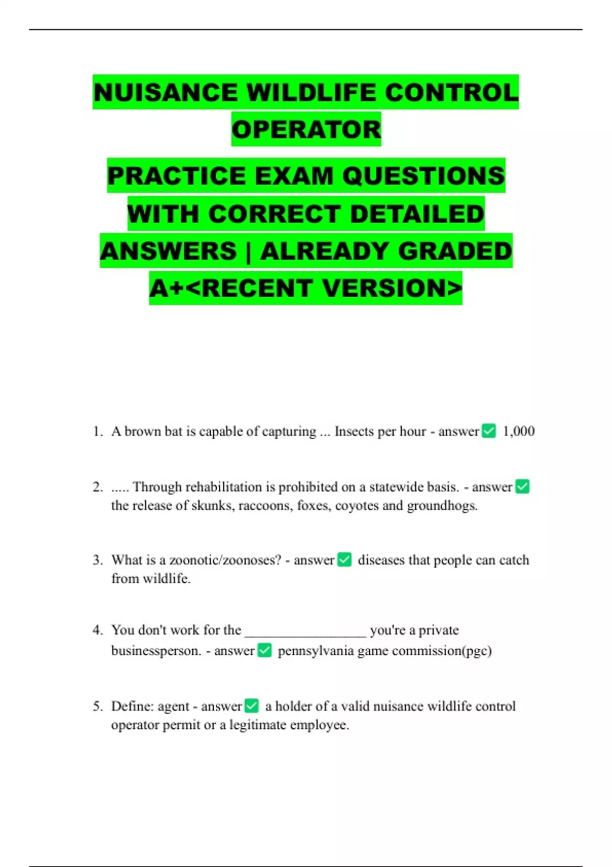 NUISANCE WILDLIFE CONTROL OPERATOR PRACTICE EXAM QUESTIONS WITH CORRECT DETAILED ANSWERS | ALREADY GRADED A+&lt;RECENT VERSION&gt; 1. A brown bat is capable of capturing ... Insects per hour - answer 1,000 2. ..... Through rehabilitation is prohibited on a statewide basis. - answer the release of skunks, raccoons, foxes, coyotes and groundhogs. 3. What is a zoonotic/zoonoses? - answer diseases that people can catch from wildlife. 4. You don't work for the _________________ you're a private businessperson. - answer pennsylvania game commission(pgc) 5. Define: agent - answer a holder of a valid nuisance wildlife control operator permit or a legitimate employee. 6. Define: humane manner - answer when dispatching an animal, death shall be induced as quickly and painlessly as possible. 7. Define: legitimate employee - answer an employee of record, one for which the employer deducts or pays taxes or other fees required by any local, state of the federal government and is listed on the permit. 8. Define: application - answer an application for examination shall be submitted on a form supplied by the commission. A non-refundable fee of $25 for each test shall be submitted with the application for new agents only. An additional $50 shall be submitted for each permit if the examination is passed. 9. Define: application part 2 - answer experience and qualification shall be listed on the application, if applicable, the business business name shall also be included. Conviction of a violation of that act within 5 years of the date of application shall preclude the issuance of a permit, an agent whose permit lapses for 2 or more years shall apply as a new applicant. 10. Records and reports: - answer a record of all activities conducted under authority of the permit can be kept on a form supplied by the commission according to instructions. Records shall be kept for 3 years & are the basis of any reports required by the commission. Records are available for inspection during normal business hours. Submit a report by the 10th of each month. 11. Approved methods: - answer foot hold traps, body gripping traps, box traps, clover traps, cage traps, net and snares. Shooting with a firearm that will induce death as quickly & painlessly as possible. 12. Dogs used to harass nuisance geese. - answer the authorization to harass geese with dogs is prohibited at any time when goslings are present at the site and during the period from june 16-july 20, when majority of adult birds are flightless. 13. Traps used should be: - answer tagged, or labeled with the permit number, or trapper i.d. number. 14. Devices shall be checked on by the agent...: - answer or property owner at least once each calendar day, but only the agent may remove an animal from a trap. 15. Nuisance wildlife should be captured..: - answer alive and within 24 hours be dispatched in a humane manner or released in an area open to hunting or trapping. 16. An agent may or may not..: - answer without a special written permission from the director, destroy or euthanize five or more bats at any one locations. 17. The taking of any..: - answer white-tail deer should be reported within 24 hours and turned over to the district wildlife conservation officer. 18. It is unlawful to..: - answer a) control any white-tail deer, black bears, elk, wild turkey, beaver, fisher, otter or bobcat without prior approval of a conservation officer. B) control any threatened or endangered species without proper permits and approval 19. Rabies: - answer a contagious, potentially fatal disease transmitted from one infected animal to another through a bite or scratch. 20. High risk/vector species of rabies: - answer skunks, raccoons, foxes, groundhogs, bats and coyotes 21. Exposure to rabies should be suspected: - answer a bat or other suspect animal is found in a house where the possibility of contact exists 22. All animals exposure specimens will be..: - answer submitted to the panimal adiagnostic laboratory system, located on north cameron street in harrisburg, pennsylvania 23. All human exposure specimens will be..: - answer collected in the southwest region and submitted to the allegheny county laboratory then the work through the allegheny county health department 24. How to submit a rabies infested animal: - answer do not submit live animals, maintained at the fridge temperature from the time of death until the presentation of the lab, do not use dry or wet ice, be placed in a watertight container, heavy plastic bag tied with a twist tie, larger waterproof container packed with a suitable amount of refrigerant(blue ice packs.) ** if fridge is not available, the specimen may be frozen 25. Clean-up of equipment (rabies): - answer using a solution mixed by adding one part clorox to nine parts water. This should destroy any rabies virus present. 26. What is a banger? - answer also know as bird bombs... An explosive cartridge that makes a loud bang to repel birds. The shell is often launched from a handheld pistol launcher, similar to a modified starter pistol. Pyrotechnic-fireworks-based repellents. Used at medium range (50-100ft) 27. What is a barbiturate? - answer group of drugs that sedate and can kill animals by interfering with the central nervous system usage is heavily restricted at federal & state levels 28. What is "best practice"? - answer effective method of solving a nuisance wildlife problem that minimizes rick to environment and our health & well-being. Supports the strategy known as "integrated wildlife damage management." 29. What is a body-gripping trap? - answer square spring-loaded, lethal trap available in multiple sizes, the animal must pass though the jaws of the trap to be captured. Ideally catches the animal directly behind the head, snapping the part of the spine thats in the upper third of the neck 30. What is a carbon dioxide(co2) chamber? - answer an enclosed space into which carbon gas is added at a controlled rate to kill an animal. Co2 causes ra