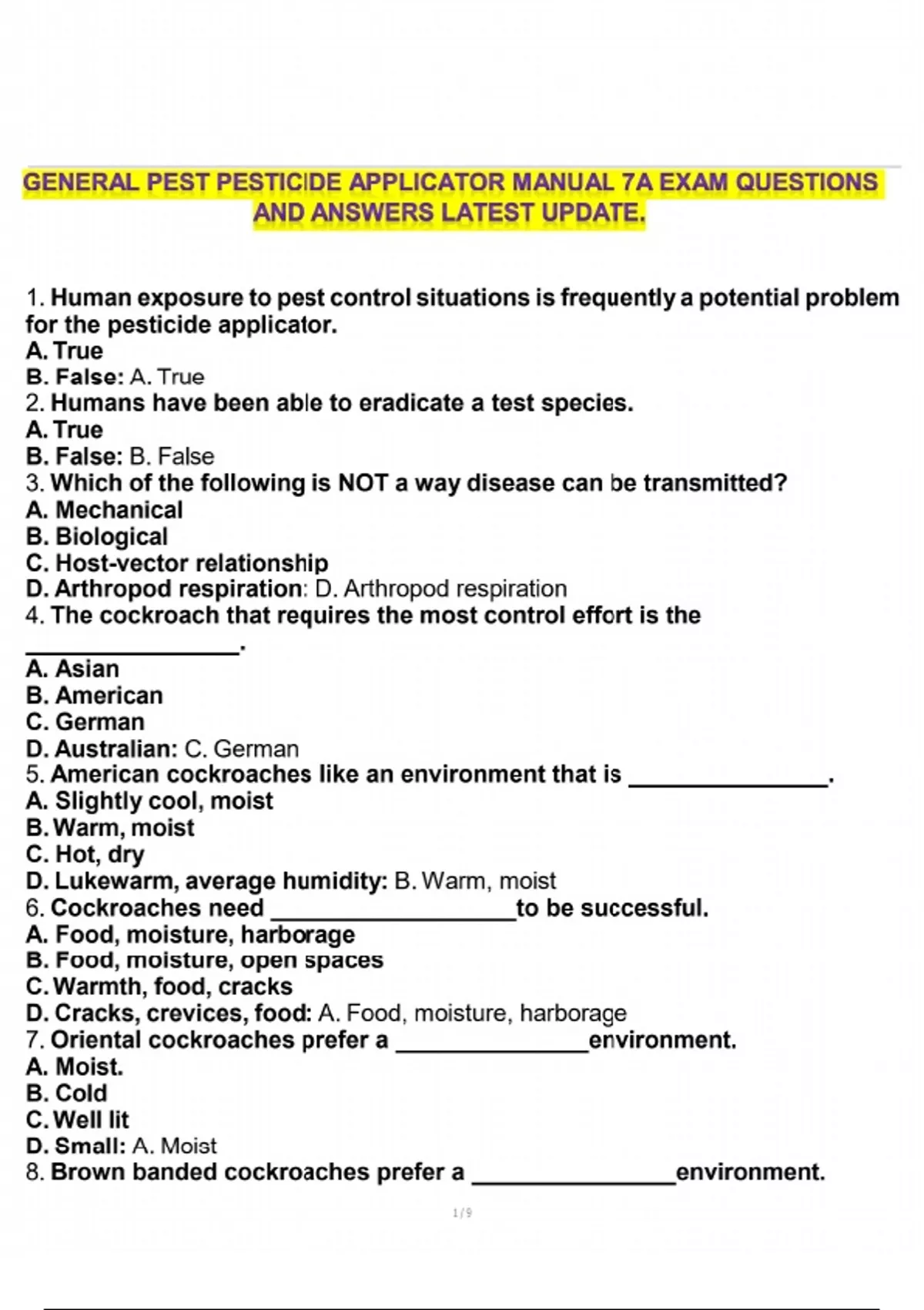 GENERAL PEST PESTICIDE APPLICATOR MANUAL 7A EXAM QUESTIONS AND ANSWERS LATEST UPDATE.
