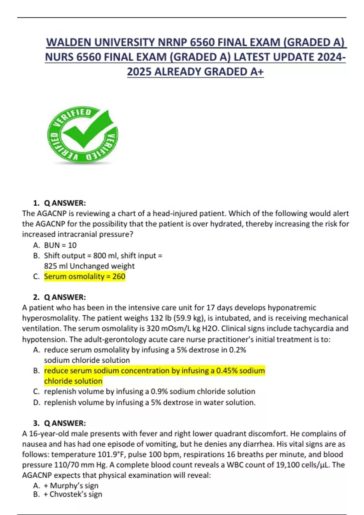WALDEN UNIVERSITY NRNP 6560 FINAL EXAM (GRADED A) NURS 6560 FINAL EXAM (GRADED A) LATEST UPDATE ALREADY GRADED A+