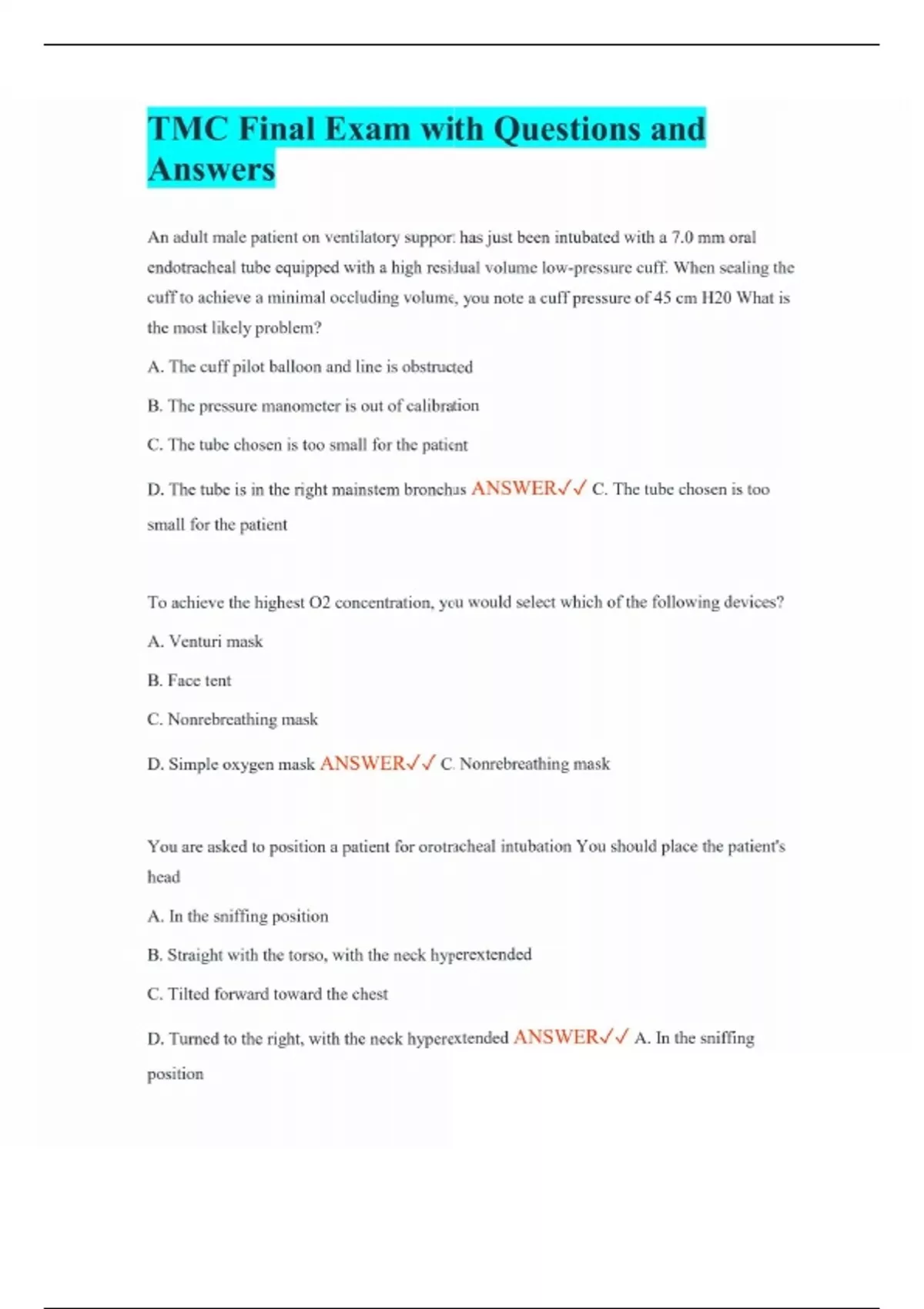 TMC Final Exam with Questions and Answers An adult male patient on ventilatory support has just been intubated with a 7.0 mm oral endotracheal tube equipped with a high residual volume low-pressure cuff. When sealing the cuff to achieve a minimal occluding volume, you note a cuff pressure of 45 cm H20 What is the most likely problem? A. The cuff pilot balloon and line is obstructed B. The pressure manometer is out of calibration C. The tube chosen is too small for the patient D. The tube is in the right mainstem bronchus ANSWER C. The tube chosen is too small for the patient To achieve the highest O2 concentration, you would select which of the following devices? A. Venturi mask B. Face tent C. Nonrebreathing mask D. Simple oxygen mask ANSWER C. Nonrebreathing mask You are asked to position a patient for orotracheal intubation You should place the patient's head A. In the sniffing position B. Straight with the torso, with the neck hyperextended C. Tilted forward toward the chest D. Turned to the right, with the neck hyperextended ANSWER A. In the sniffing position