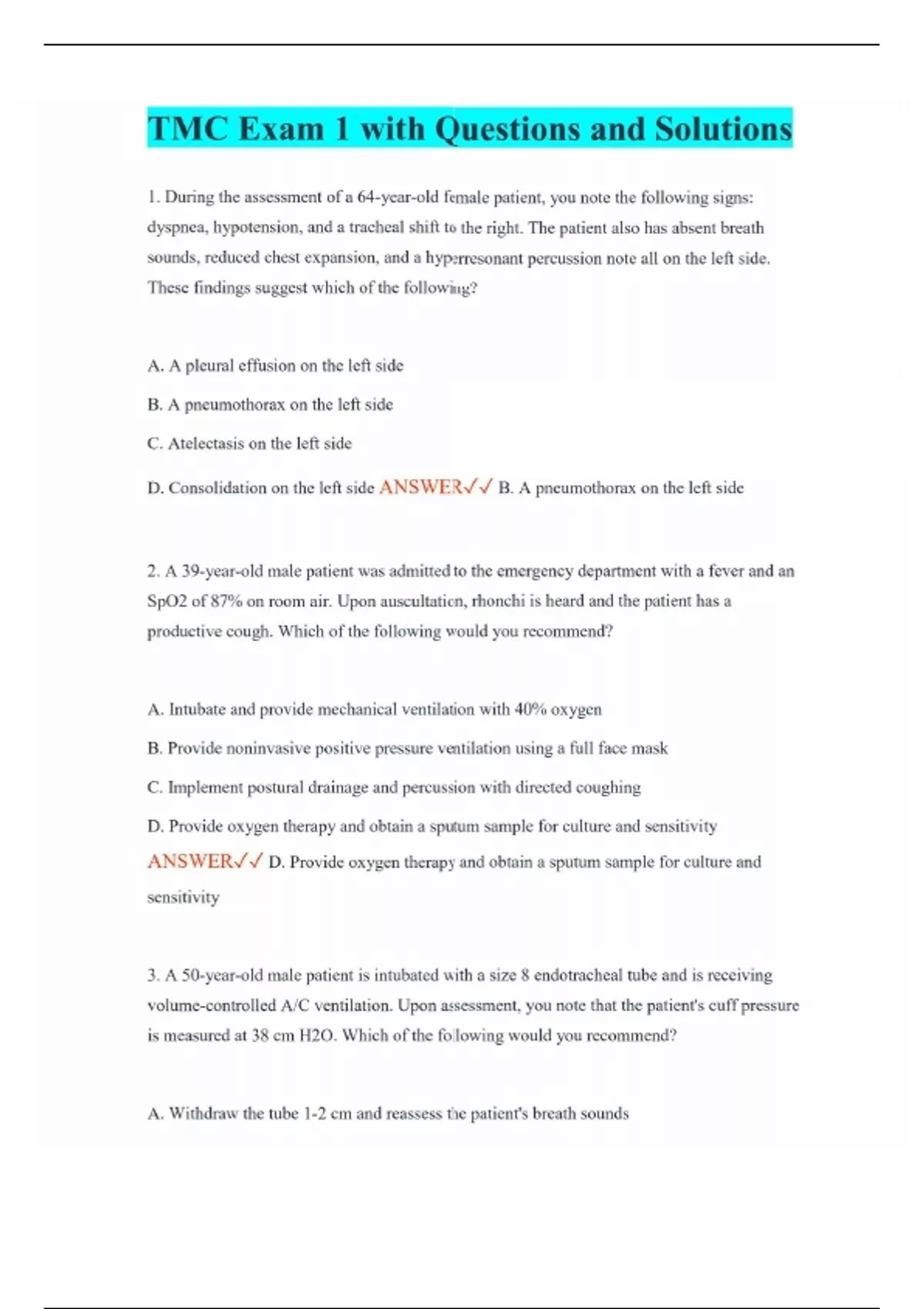 TMC Exam 1 with Questions and Solutions 1. During the assessment of a 64-year-old female patient, you note the following signs: dyspnea, hypotension, and a tracheal shift to the right. The patient also has absent breath sounds, reduced chest expansion, and a hyperresonant percussion note all on the left side. These findings suggest which of the following? A. A pleural effusion on the left side B. A pneumothorax on the left side C. Atelectasis on the left side D. Consolidation on the left side ANSWER B. A pneumothorax on the left side 2. A 39-year-old male patient was admitted to the emergency department with a fever and an SpO2 of 87% on room air. Upon auscultation, rhonchi is heard and the patient has a productive cough. Which of the following would you recommend? A. Intubate and provide mechanical ventilation with 40% oxygen B. Provide noninvasive positive pressure ventilation using a full face mask C. Implement postural drainage and percussion with directed coughing D. Provide oxygen therapy and obtain a sputum sample for culture and sensitivity ANSWER D. Provide oxygen therapy and obtain a sputum sample for culture and sensitivity 3. A 50-year-old male patient is intubated with a size 8 endotracheal tube and is receiving volume-controlled A/C ventilation. Upon assessment, you note that the patient's cuff pressure is measured at 38 cm H2O. Which of the following would you recommend? A. Withdraw the tube 1-2 cm and reassess the patient's breath sounds