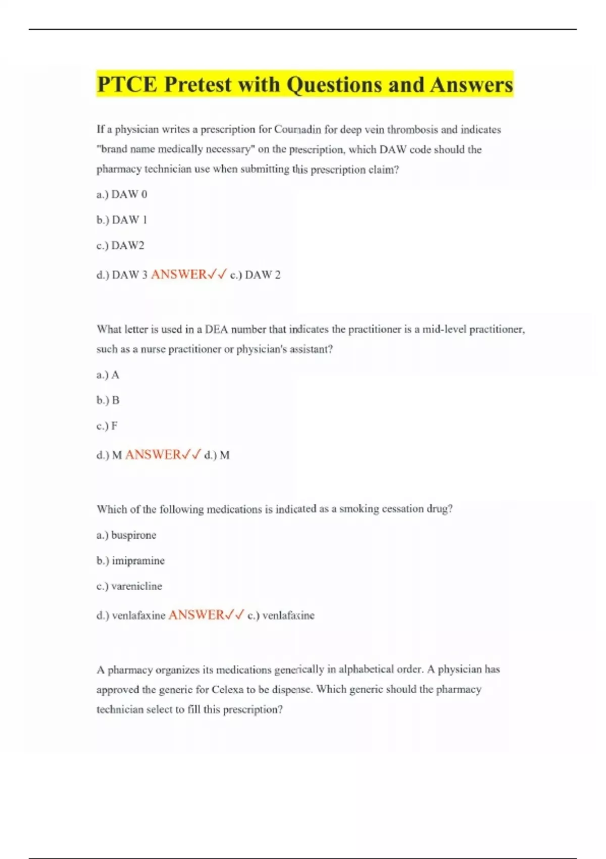 PTCE Pretest with Questions and Answers If a physician writes a prescription for Coumadin for deep vein thrombosis and indicates "brand name medically necessary" on the prescription, which DAW code should the pharmacy technician use when submitting this prescription claim? a.) DAW 0 b.) DAW 1 c.) DAW2 d.) DAW 3 ANSWER c.) DAW 2 What letter is used in a DEA number that indicates the practitioner is a mid-level practitioner, such as a nurse practitioner or physician's assistant? a.) A b.) B c.) F d.) M ANSWER d.) M Which of the following medications is indicated as a smoking cessation drug? a.) buspirone b.) imipramine c.) varenicline d.) venlafaxine ANSWER c.) venlafaxine A pharmacy organizes its medications generically in alphabetical order. A physician has approved the generic for Celexa to be dispense. Which generic should the pharmacy technician select to fill this prescription?