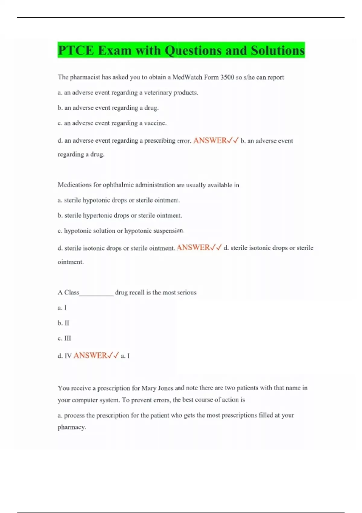 PTCE Exam with Questions and Solutions The pharmacist has asked you to obtain a MedWatch Form 3500 so s/he can report a. an adverse event regarding a veterinary products. b. an adverse event regarding a drug. c. an adverse event regarding a vaccine. d. an adverse event regarding a prescribing error. ANSWER b. an adverse event regarding a drug. Medications for ophthalmic administration are usually available in a. sterile hypotonic drops or sterile ointment. b. sterile hypertonic drops or sterile ointment. c. hypotonic solution or hypotonic suspension. d. sterile isotonic drops or sterile ointment. ANSWER d. sterile isotonic drops or sterile ointment. A Class__________ drug recall is the most serious a. I b. II c. III d. IV ANSWER a. I You receive a prescription for Mary Jones and note there are two patients with that name in your computer system. To prevent errors, the best course of action is a. process the prescription for the patient who gets the most prescriptions filled at your pharmacy.