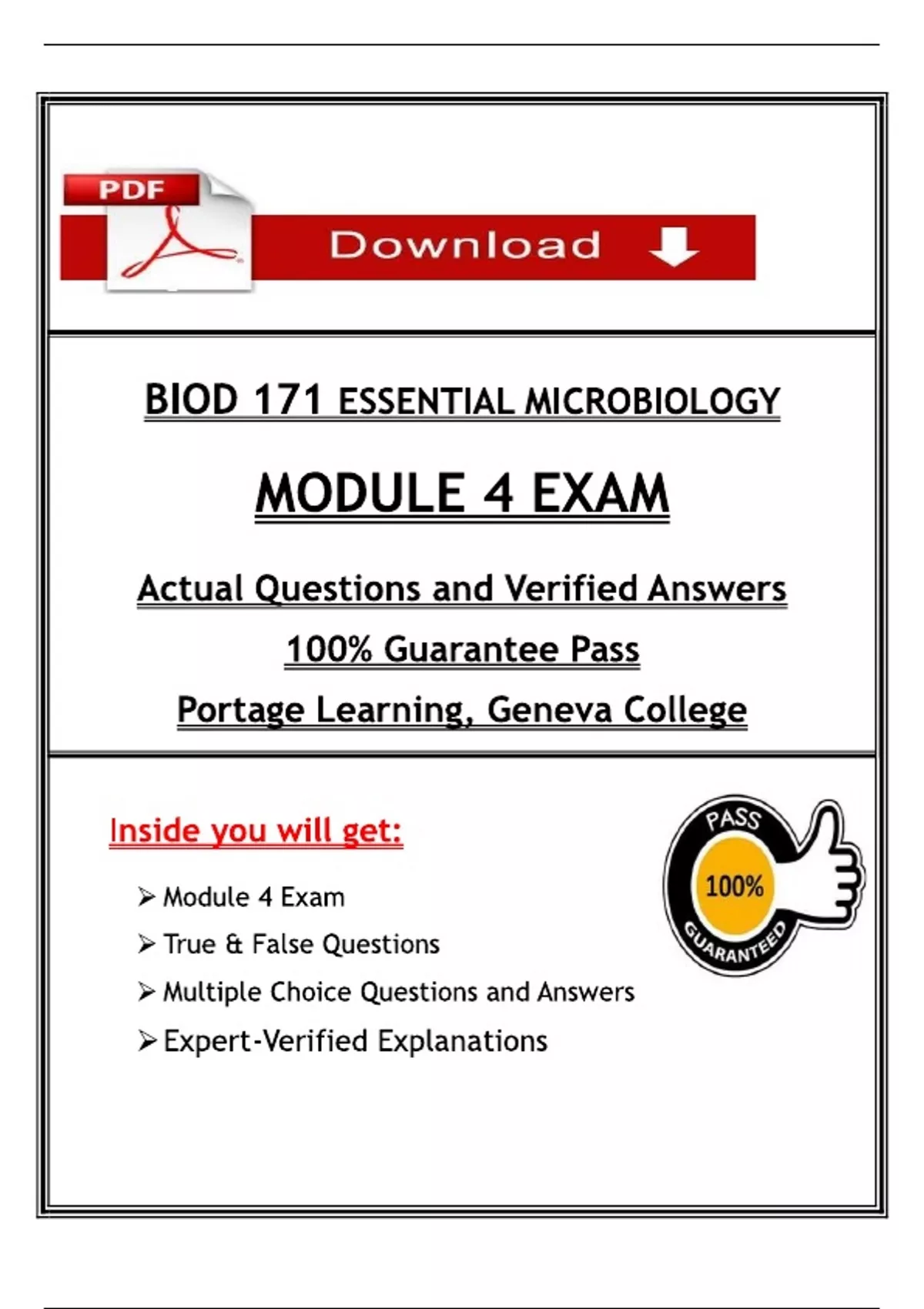 2025 Essential Microbiology BIOD 171 Module 4 Exam – Portage Learning / Geneva College / ABC Nursing Master the critical concepts of microbiology with the 2025 Essential Microbiology BIOD 171 Module 4 Exam, tailored specifically for students at Portage Learning, Geneva College, and ABC Nursing programs. This comprehensive exam focuses on vital topics such as microbial metabolism, antimicrobial agents, and disease prevention strategies as outlined in the 2025 academic syllabus. Designed to support nursing students, allied health learners, and biology majors, this exam offers a wide range of practice questions and in-depth explanations to reinforce your knowledge and improve exam performance. Stay ahead in your BIOD 171 course by utilizing this expertly crafted study guide that aligns perfectly with your college’s curriculum. --- 2025 Essential Microbiology BIOD 171 Module 4 exam, Portage Learning BIOD 171 Module 4 test, Geneva College microbiology exam 2025, ABC Nursing microbiology Module 4 exam, BIOD 171 Module 4 quiz Portage Learning, 2025 microbiology test Geneva College, ABC Nursing BIOD 171 practice exam, Portage Learning microbiology Module 4 test 2025, Geneva College essential microbiology exam, ABC Nursing microbiology 2025 test questions, BIOD 171 Module 4 assessment Portage Learning, Geneva College microbiology exam prep 2025, ABC Nursing microbiology quiz Module 4