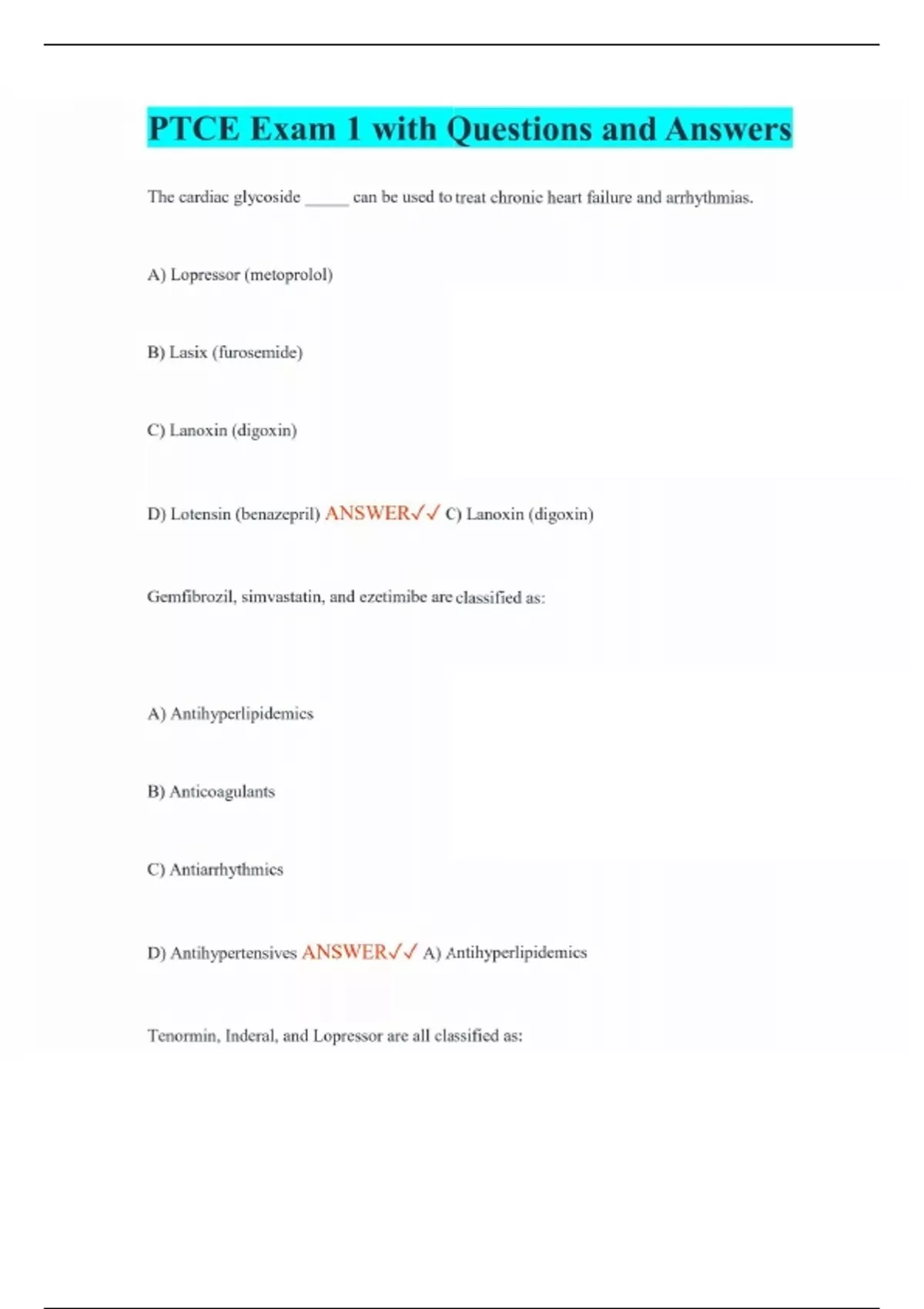 PTCE Exam 1 with Questions and Answers The cardiac glycoside _____ can be used to treat chronic heart failure and arrhythmias. A) Lopressor (metoprolol) B) Lasix (furosemide) C) Lanoxin (digoxin) D) Lotensin (benazepril) ANSWER C) Lanoxin (digoxin) Gemfibrozil, simvastatin, and ezetimibe are classified as: A) Antihyperlipidemics B) Anticoagulants C) Antiarrhythmics D) Antihypertensives ANSWER A) Antihyperlipidemics Tenormin, Inderal, and Lopressor are all classified as: