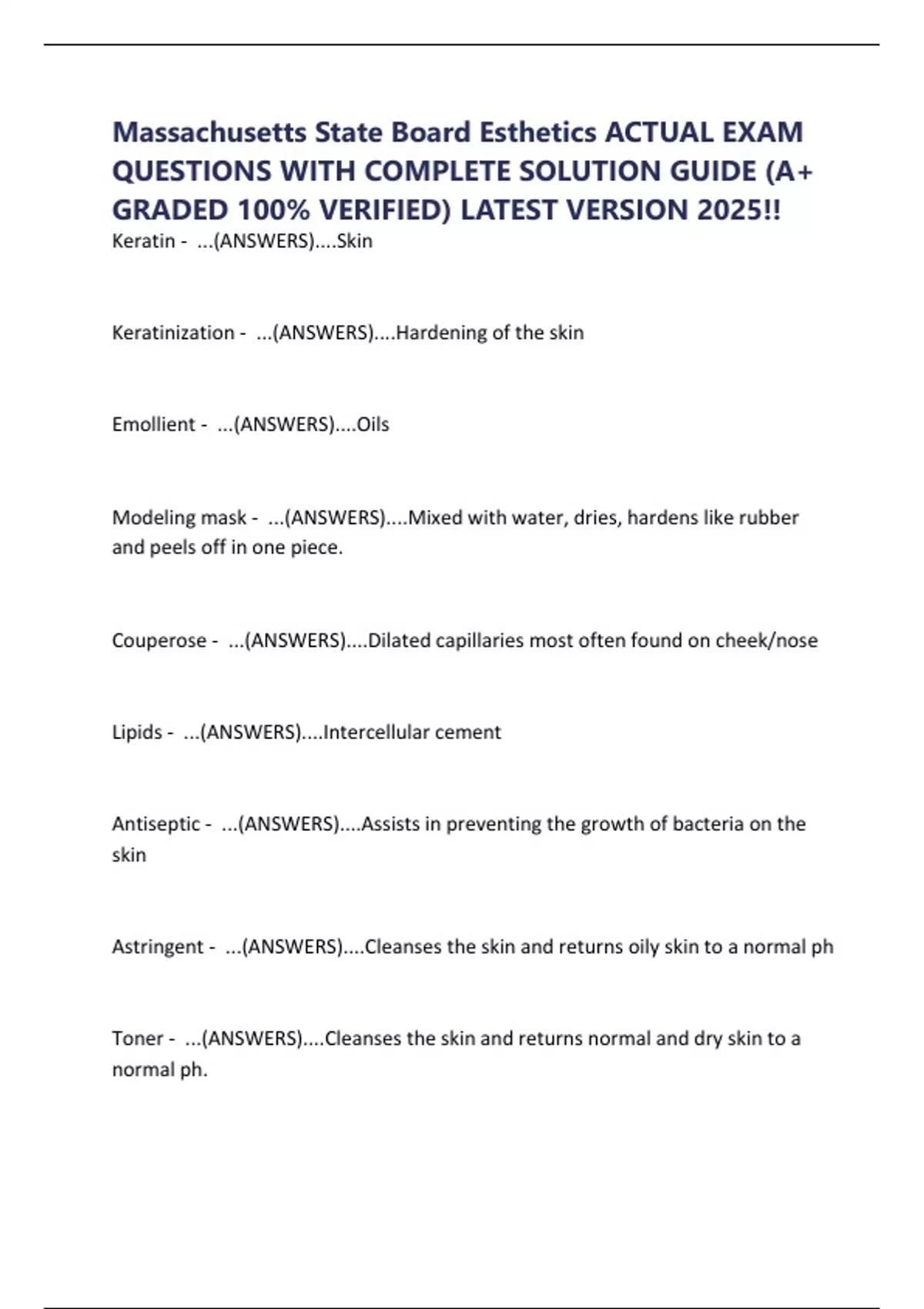 Massachusetts State Board Esthetics ACTUAL EXAM QUESTIONS WITH COMPLETE SOLUTION GUIDE (A+ GRADED 100% VERIFIED) LATEST VERSION 2025!!