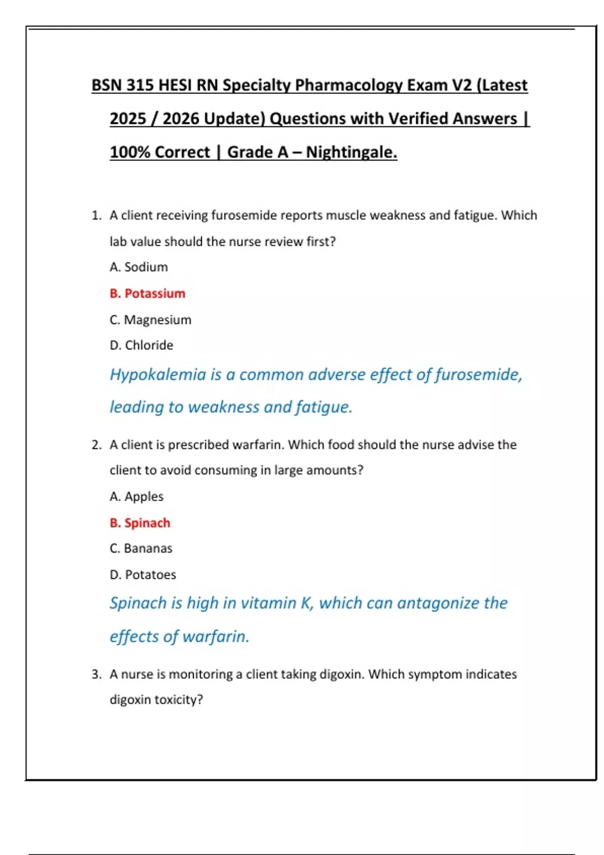 Here is the continuation of the BSN 315 – HESI RN Specialty Pharmacology Exam