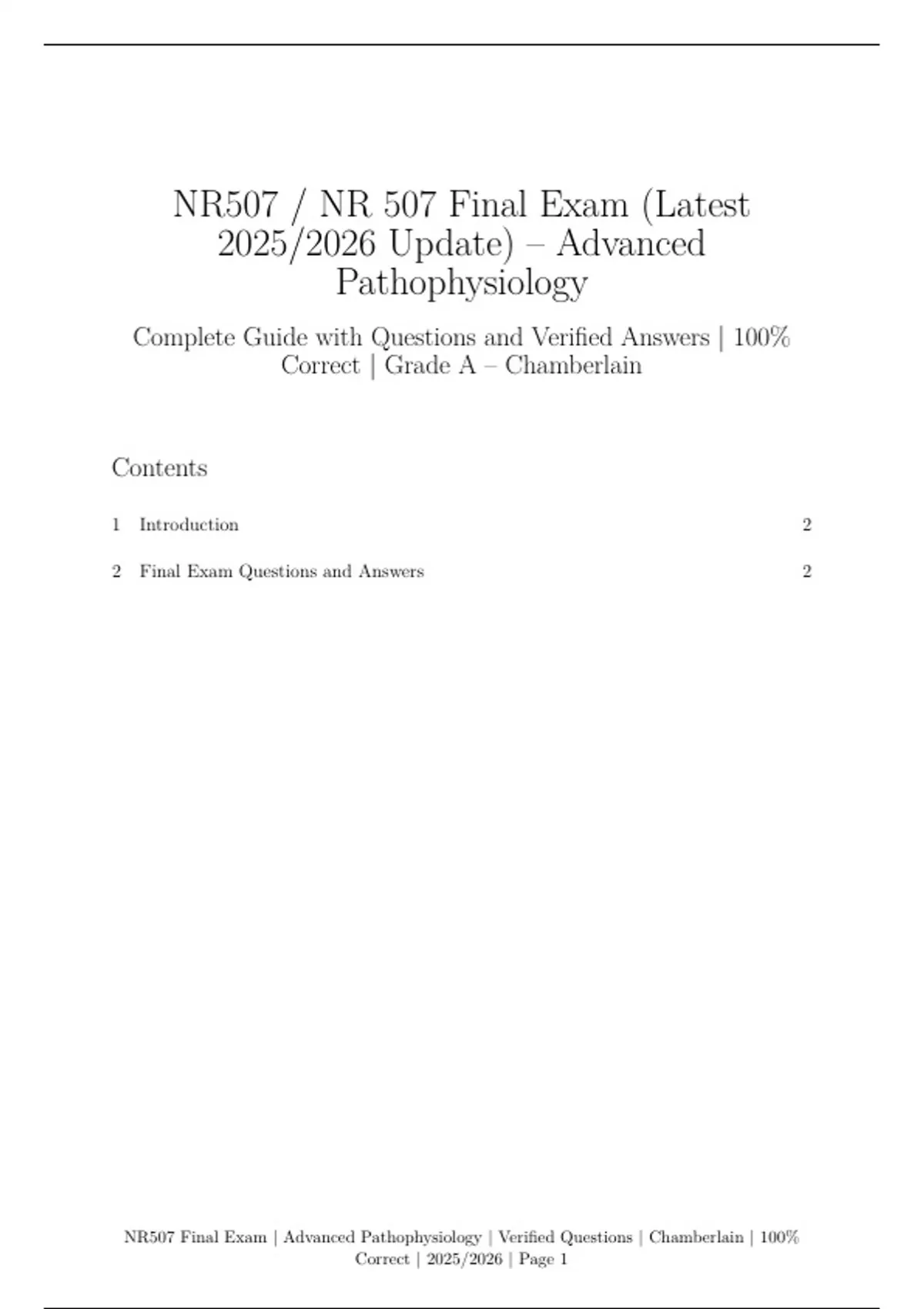 This document contains the full set of final exam questions and verified correct answers for NR507 / NR 507 – Advanced Pathophysiology at Chamberlain University, updated for the 2025/2026 academic year. It is designed to help students achieve top grades by covering all essential pathophysiological concepts tested in the course.