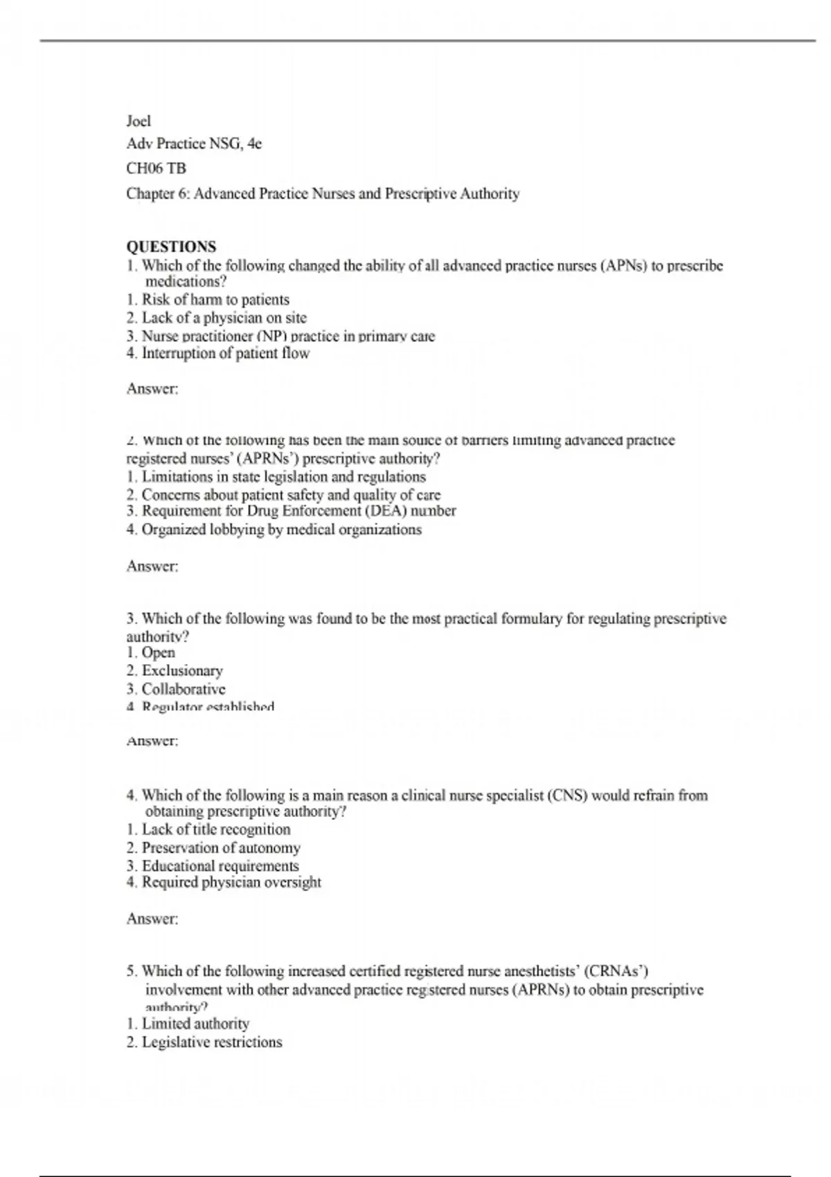 Joel Adv Practice NSG, 4e CH06 TB Chapter 6: Advanced Practice Nurses and Prescriptive Authority