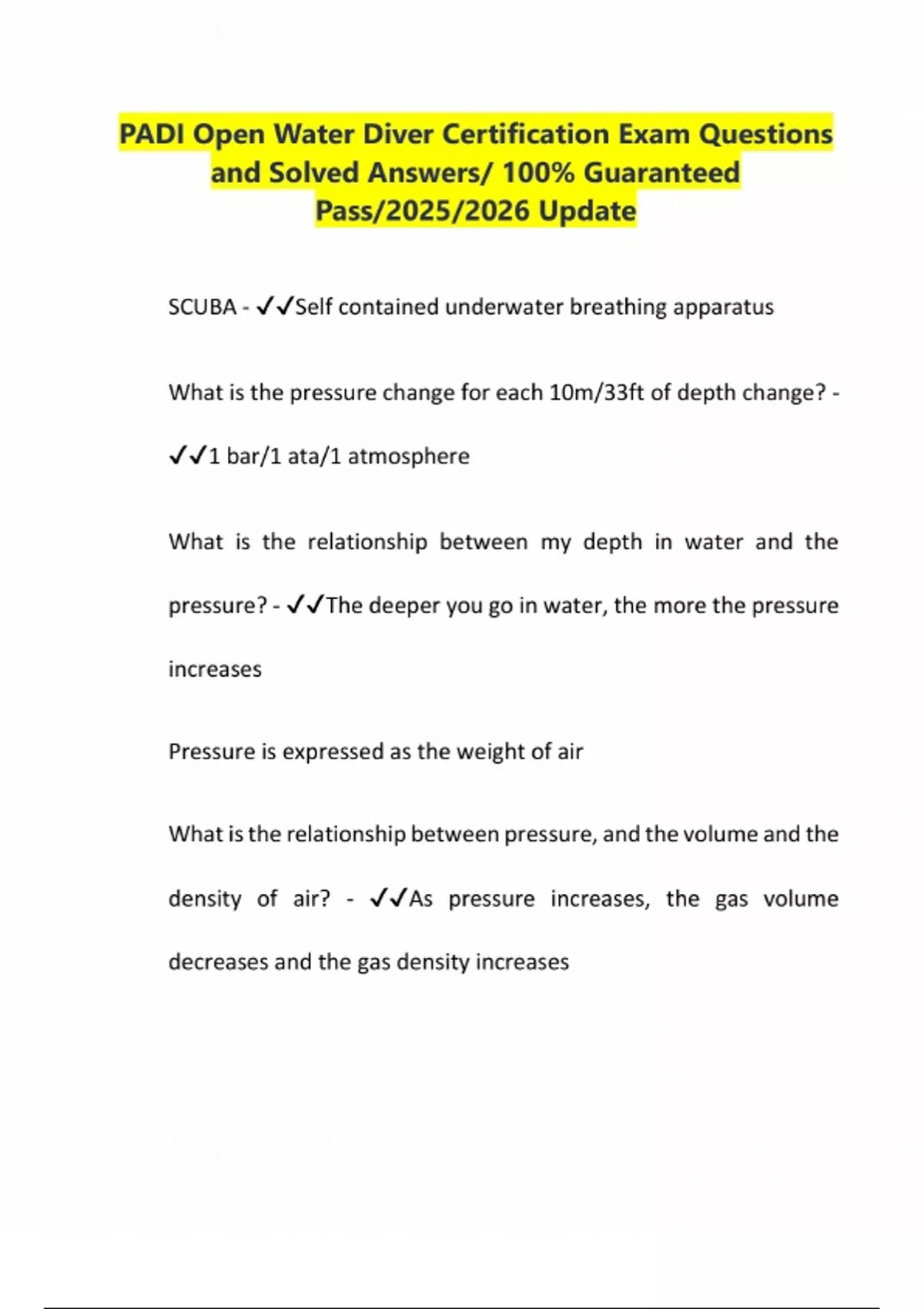 PADI Open Water Diver Certification Exam Questions and Solved Answers/ 100% Guaranteed Pass/2025/2026 Update SCUBA - Self contained underwater breathing apparatus What is the pressure change for each 10m/33ft of depth change? - 1 bar/1 ata/1 atmosphere What is the relationship between my depth in water and the pressure? - The deeper you go in water, the more the pressure increases Pressure is expressed as the weight of air What is the relationship between pressure, and the volume and the density of air? - As pressure increases, the gas volume decreases and the gas density increasesIf I take a volume of air from one depth to another depth, how much will the volume and density change? - Volume will be 1/ata# Density will be ata# What 3 major body air spaces does increasing pressure affect as I descend? - Ears, sinuses, mask What is a "squeeze"? - The discomfort caused by pressure imbalance pulling tissue into the air space What is "equalization"? - The addition of air to your air spaces as you descend How do I equalize as I descend? - For ears and sinuses, pinch your nose and blow gently, or wiggle your jaw and swallow For mask, blow into it with noseHow often should I equalize? - Every meter/few feet, BEFORE you feel discomfort What should I do if I can't equalize? - Stop your descent, signal problem and point to your ear, ascend a b