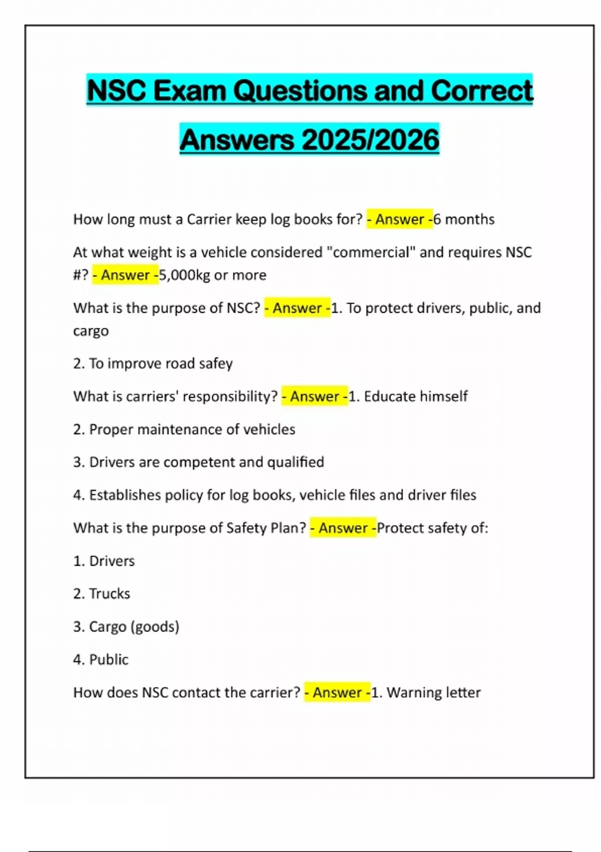 NSC Exam Questions and Correct Answers 2025/2026 How long must a Carrier keep log books for? - Answer -6 months At what weight is a vehicle considered "commercial" and requires NSC #? - Answer -5,000kg or more What is the purpose of NSC? - Answer -1. To protect drivers, public, and cargo 2. To improve road safey What is carriers' responsibility? - Answer -1. Educate himself 2. Proper maintenance of vehicles 3. Drivers are competent and qualified 4. Establishes policy for log books, vehicle files and driver files What is the purpose of Safety Plan? - Answer -Protect safety of: 1. Drivers 2. Trucks 3. Cargo (goods) 4. Public How does NSC contact the carrier? - Answer -1. Warning letter2. Safety plan assessment 3. Audit 4. Recommendation of NSC certification to be cancelled How long must a driver's abstract be kept for? - Answer -Current + 4 years How long must a driver's ticket, training records, or disciplinary action letter be retained for by the carrier? - Answer -Current + 4 years Accident reports must be kept for how long? Accident files must be retained for how long by the carrier? - Answer -Current + 4 years Howe long must supporting documents be kept for? - Answer -6 months Vehicle records such as maintenance must be kept for how long? - Answer -3 years How often should driver logs be submitted to carrier? - Answer -within 20 days How long does a carrier keep the pre-inspections? - Answer -3 months How often should a carrier request drivers abstracts? - Answer -Once on hire; then annually What is a recall system? - Answer -A reminder system to remind if important dates-license expiry, CVP expiry ect. How many hours are legal "on duty" in a day? - Answer -14 (13 max driving) How many hours off does a driver need in a day? - Answer -10 (8 must be sleep